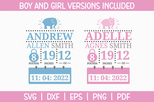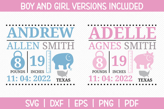 Elephant Boy and Girl Birth Stats Announcement SVG