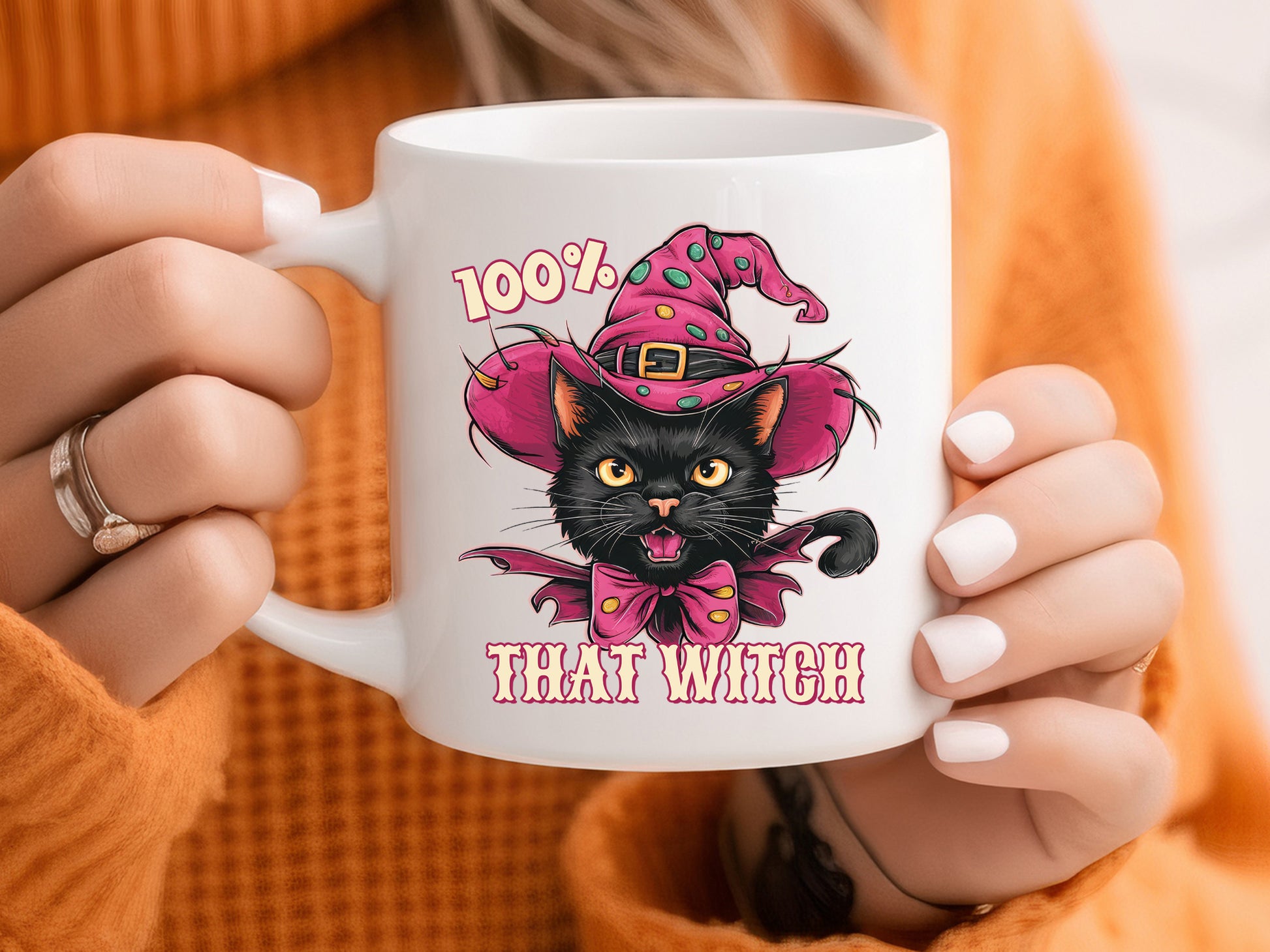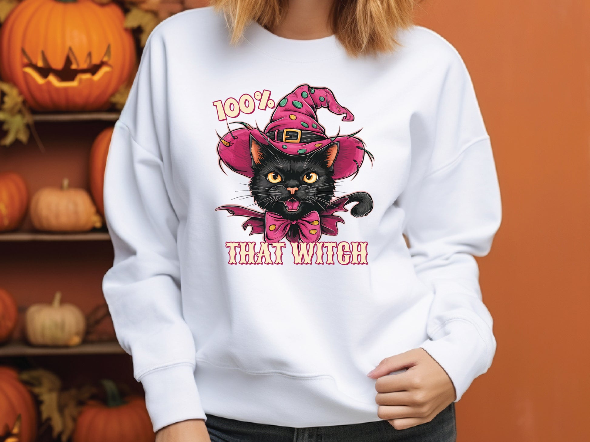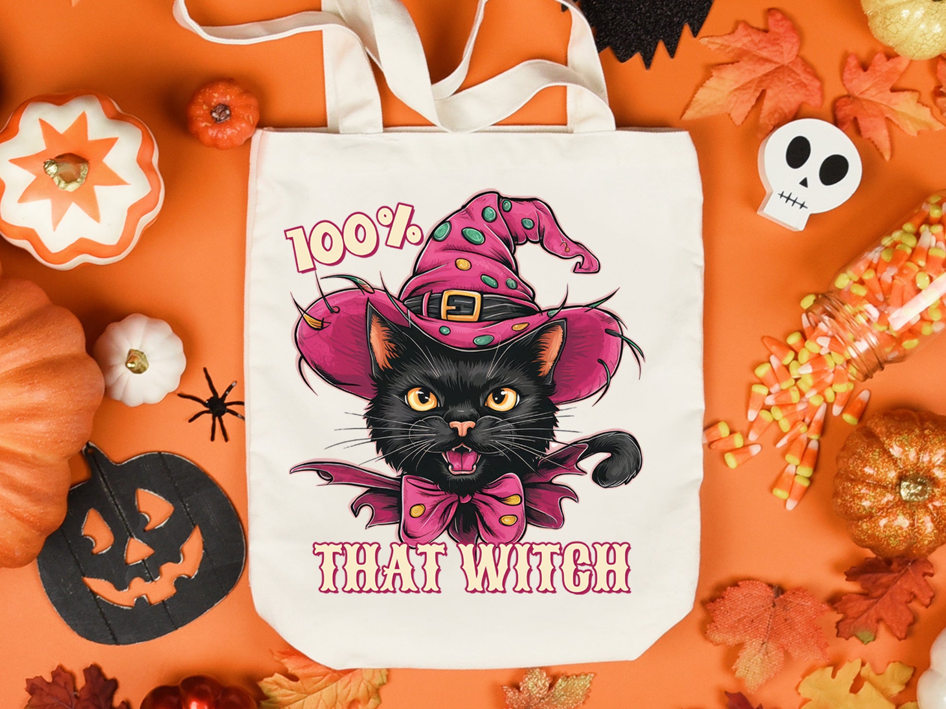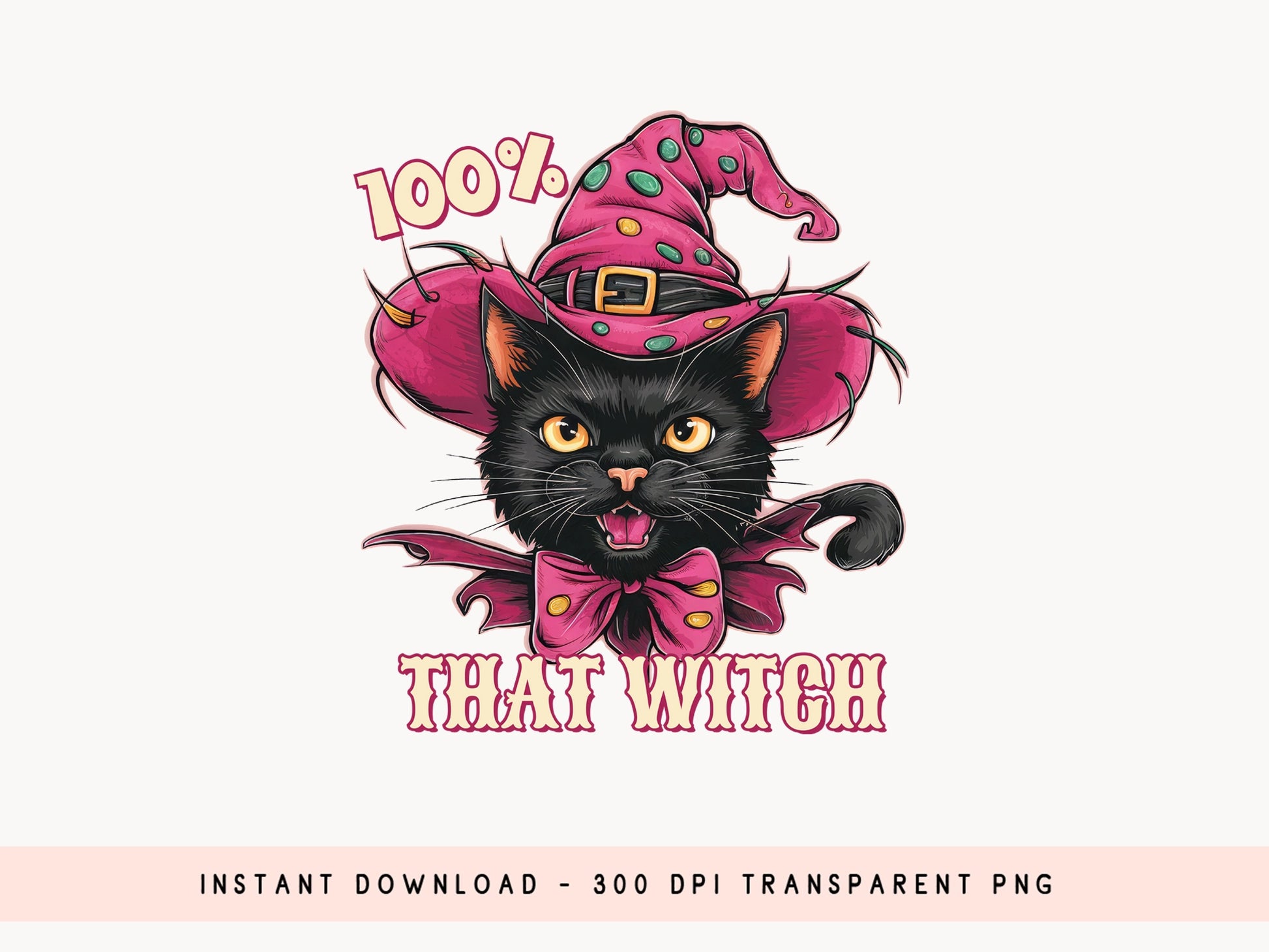 Explore our "100% That Witch - Pink Halloween Sublimation Png" perfect for those who like their witchy vibes with a twist of fun. It includes a mischievous black cat dressed as a witch, wearing a playful pink hat and a charming bow tie that will elevate your personalized apparel, accessories, and decorations. Whether you're making sweatshirts, mugs, tote bags, cards, and any other physical products, this Pink Halloween Sublimation Png is a great option, available for sublimation transfer. Show off your witchy confidence with "100% That Witch" design! Order now and add a pop of pink to your spooky projects.