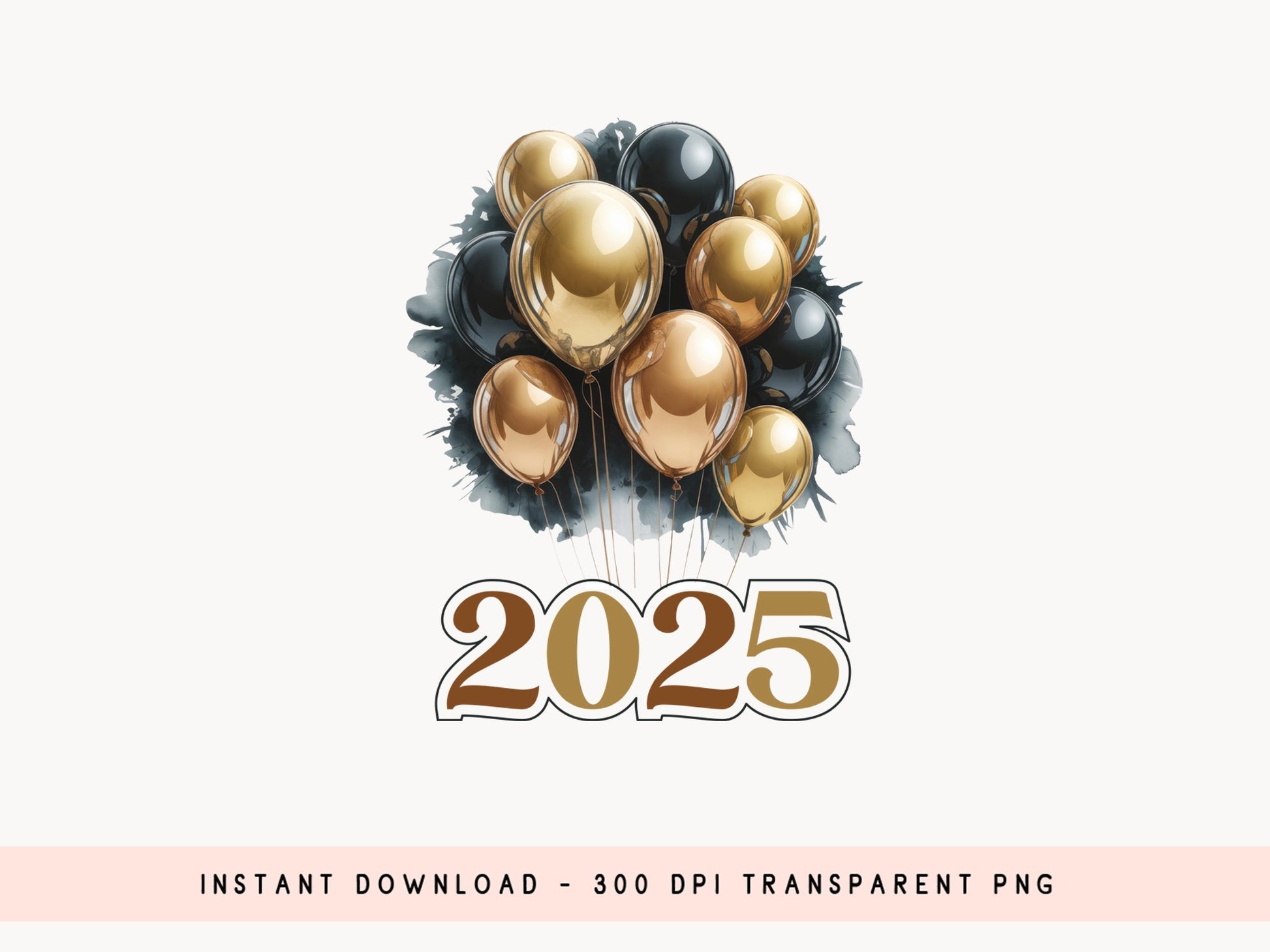 Explore our 2025 New Year PNG Sublimation Design, featuring a cluster of black and gold balloons floating against a watercolor background. Perfect for adding a bright, celebratory touch to your New Year’s eve t-shirts, mugs, hoodies, tumblers, or party decor items. This high-resolution PNG file ideal for sublimation on various surfaces. Whether crafting for yourself or making holiday gifts, the New Year PNG Sublimation Design is a great option. Simply print and press to bring festive flair to any physical item. Start 2025 with a creative spark and share the joy of new beginnings with this stunning design! Grab now.