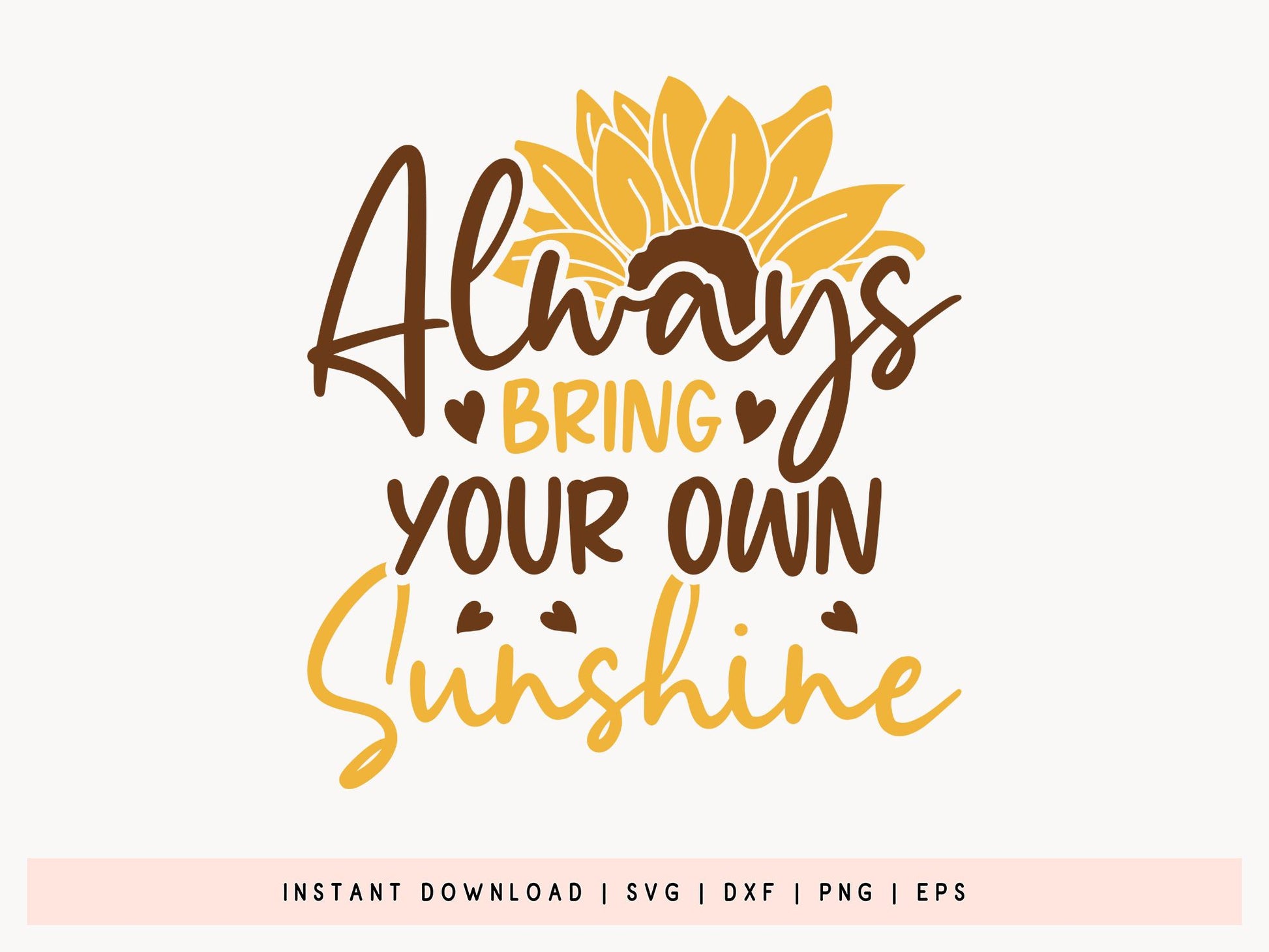 Always Bring You Own Sunshine - Sunflower Shirt SVG design is an elegant graphic that can be used for making heartfelt gifts and creative projects. It includes an adorable sunflower illustration alongside an inspiring quote. This design is perfect for creating shirts, cheerful tote bags, lovely home décor, or home decor items filled with good vibes. Our Sunflower Shirt SVG is fully customizable and available in SVG, DXF, PNG, and EPS formats. The design is suitable for Cricut, Silhouette, and other cutting machines. If you’re making something special for yourself or crafting thoughtful items for friends and family, this Sunflower Shirt SVG is a versatile addition. Shop now!