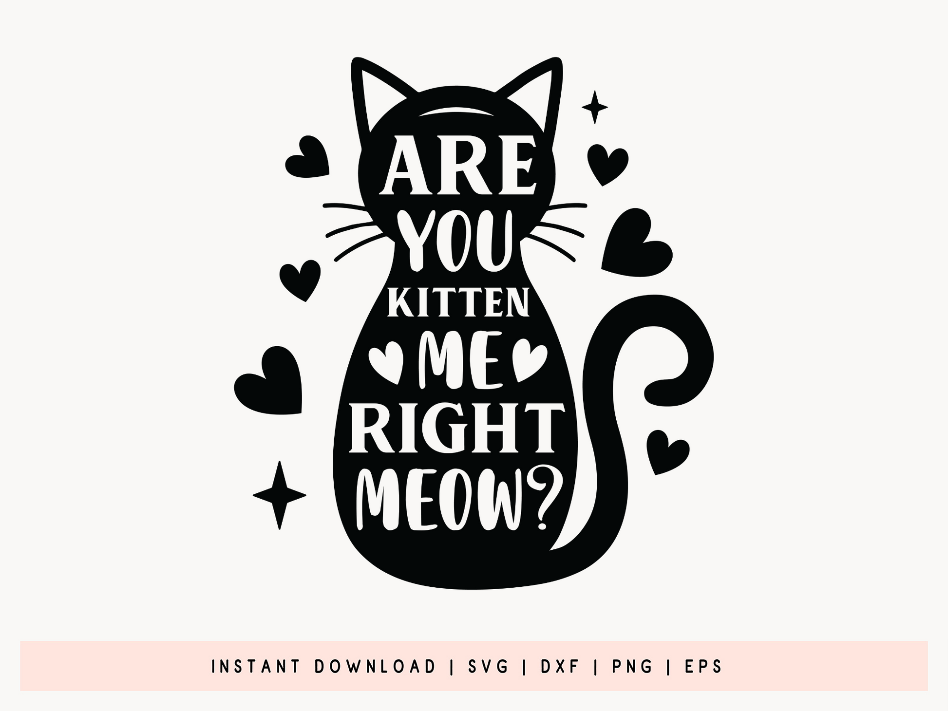 Discover our Are You Kitten Me Right Meow - Cute Cat SVG. This heartwarming design is just right for cat lovers and DIY enthusiast. Fully customizable, the Cute Cat SVG is perfect for making personalized signs, pillows, mugs, shirts, and so much more. Whether you're crafting for your own home or creating thoughtful gifts for fellow cat lovers, this versatile design adds a cozy vibe to any project. It's compatible with Cricut, Silhouette, and other cutting machines, and comes in SVG, DXF, PNG, and EPS formats for your convenience. Express your love for cats with this charming and handmade Cute Cat SVG graphic.
