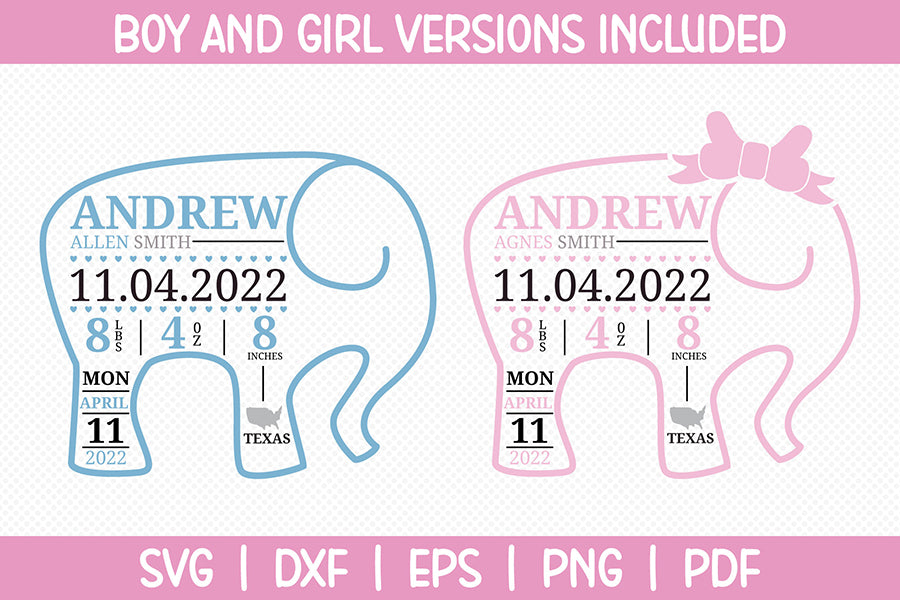 Announce the birth of your baby elephant with our lovable Elephant Birth Announcement SVG design. Share the joy of your newest family member's arrival with this delightful design. Perfect for creating your creative crafting projects.