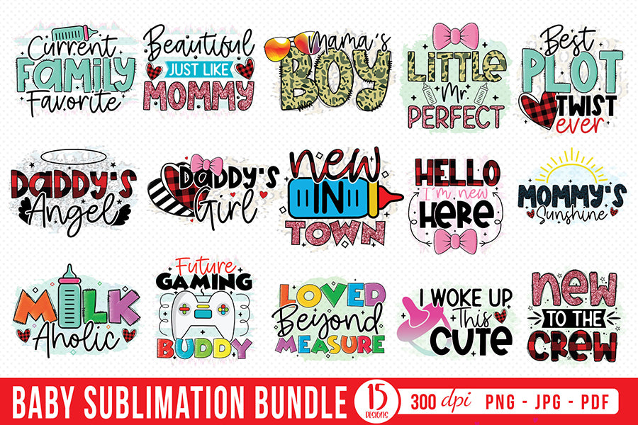 Purchase our Baby Sublimation Designs Bundle! Featuring 15 adorable and versatile designs perfect for creating unique baby apparel, accessories, and gifts. Perfect for sublimation enthusiasts! Ready to press DTF and sublimation transfers. With high-quality graphics and vibrant colors, these designs are sure to elevate your sublimation projects. You can print t-shirts, toddlers, onesies, mugs and other baby-themed personalized items. Get your hands on this fantastic collection today and start creating eye-catching and personalized products for newborn babies.