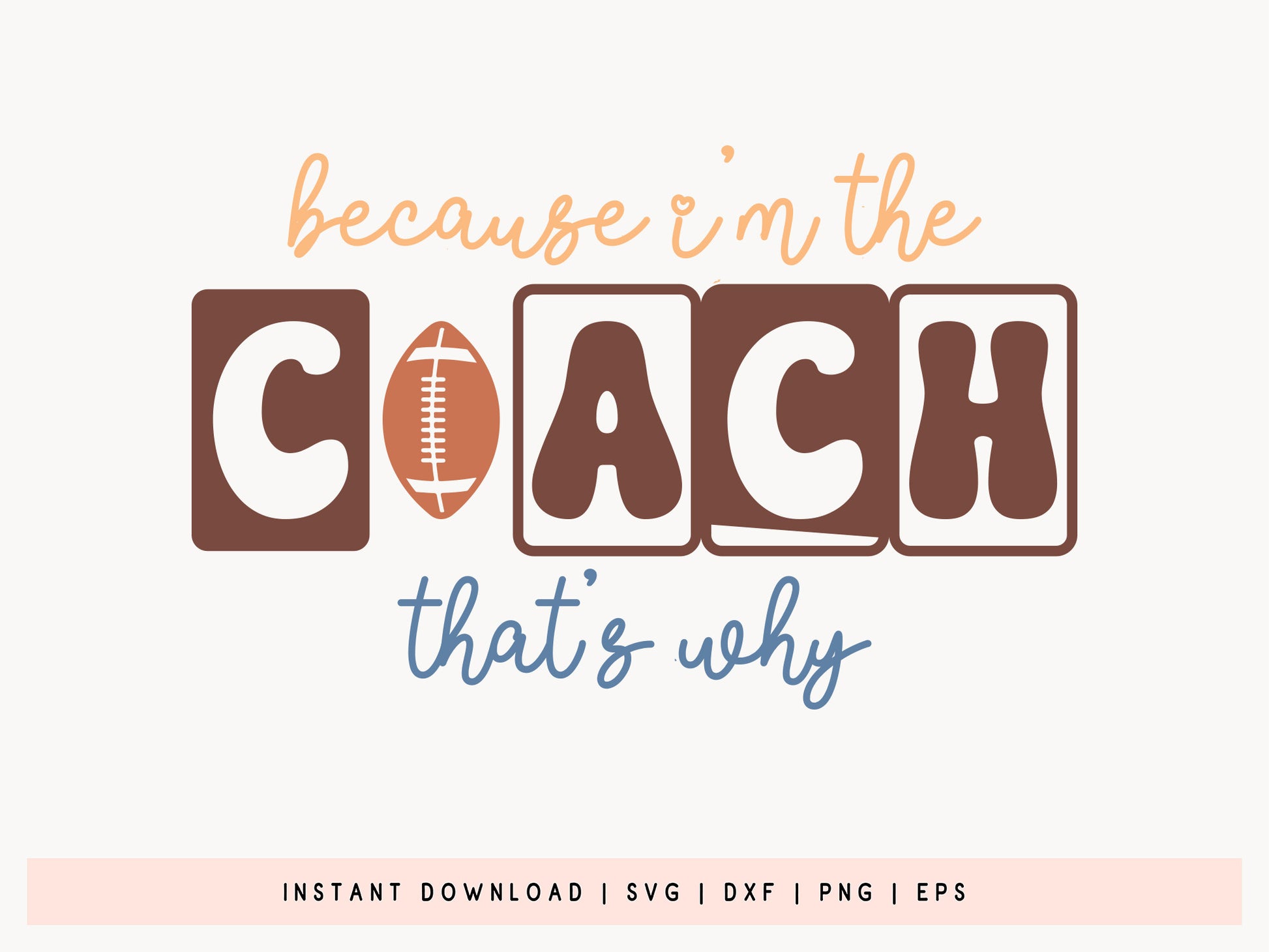 Show your coaching pride with the "Because I'm the Coach That's Why - Retro Football SVG"! This playful design is perfect for making T-shirts, hats, hoodies, sweatshirts, jerseys, tote bags, and more that highlight your role as the ultimate leader on the field. Featuring a retro-inspired style, it’s ideal for Cricut and Silhouette projects, adding personality to any game-day outfit. Whether you’re prepping for football season or celebrating a special coach in your life, this Retro Football SVG is a must-have for sports fans and creative crafters. Let your projects make a statement with this fun and handmade "Because I'm the Coach That's Why" design. Download now!