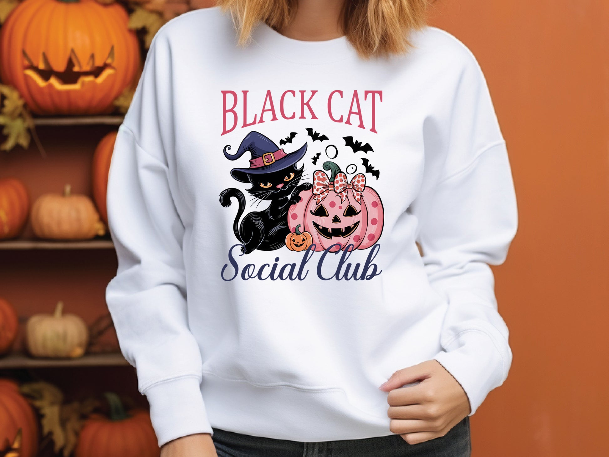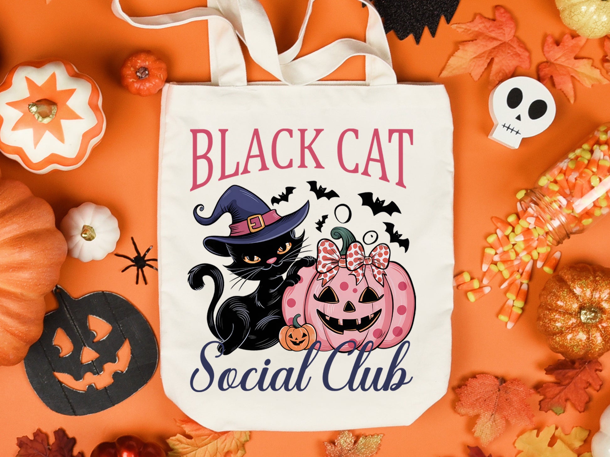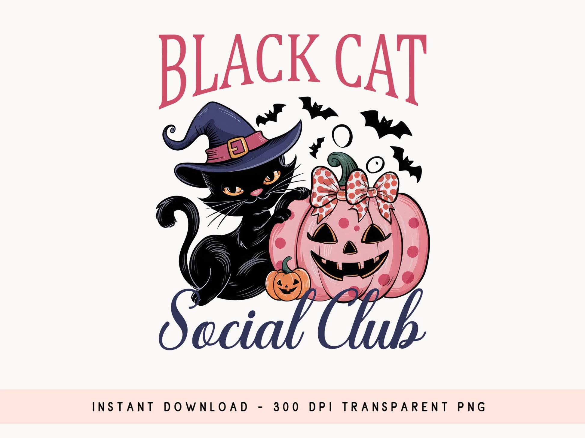 Download this "Black Cat Social Club - Pink Halloween Sublimation Print", an exclusive addition that is made to be used for sublimation printing. Featuring a black cat dressed as a witch, sitting next to a pink pumpkin with polka dots, with bats flying around them, making a fun and festive design. Best for applying on your physical products as gifts or selling the products you print such as sweatshirts, mugs, tote bags, t-shirts, and much more. The "Black Cat Social Club" design adds a unique touch to your Halloween creations. It is designed to enhance your creative projects or products. Grab the Pink Halloween Sublimation Print today!