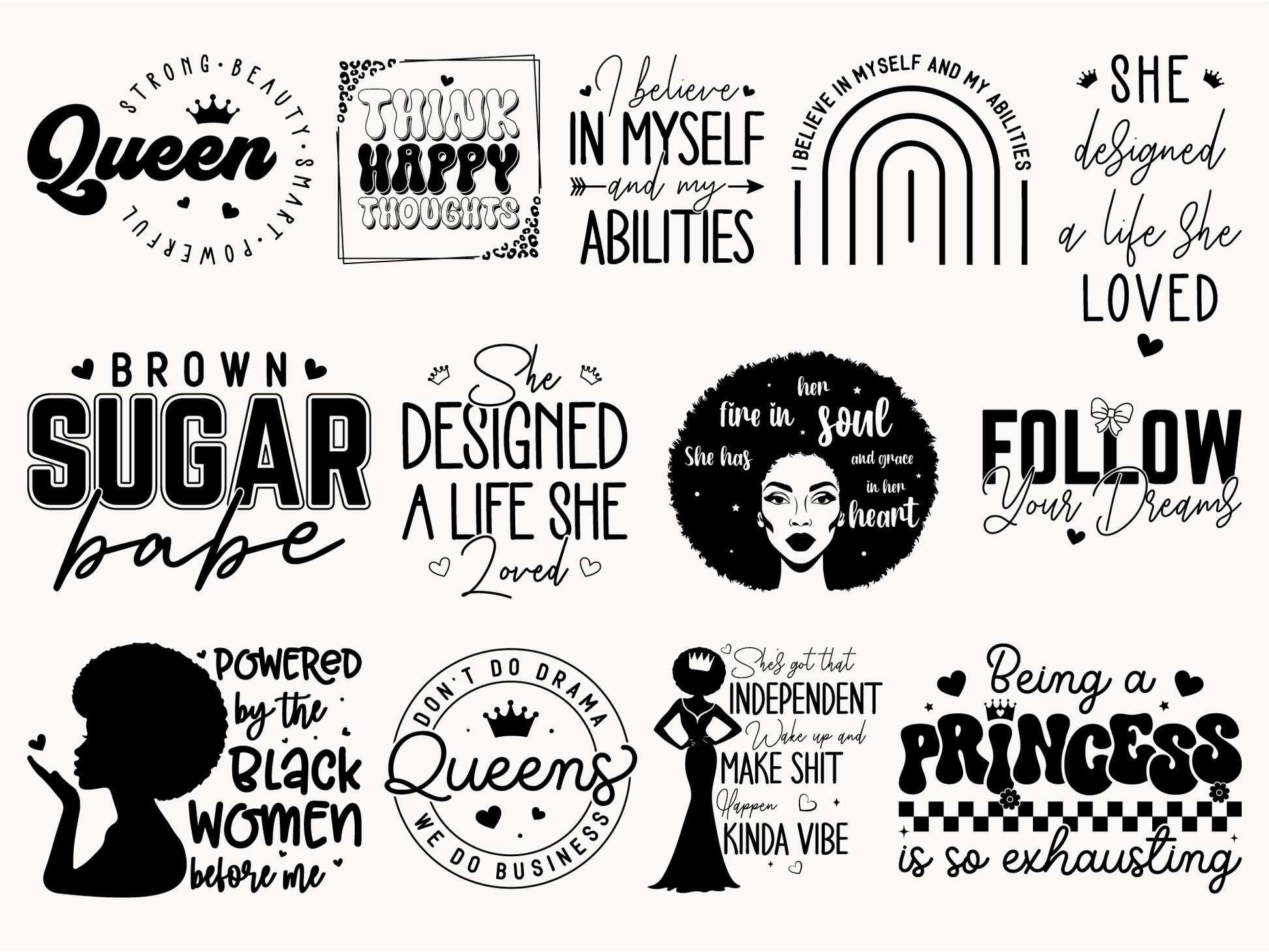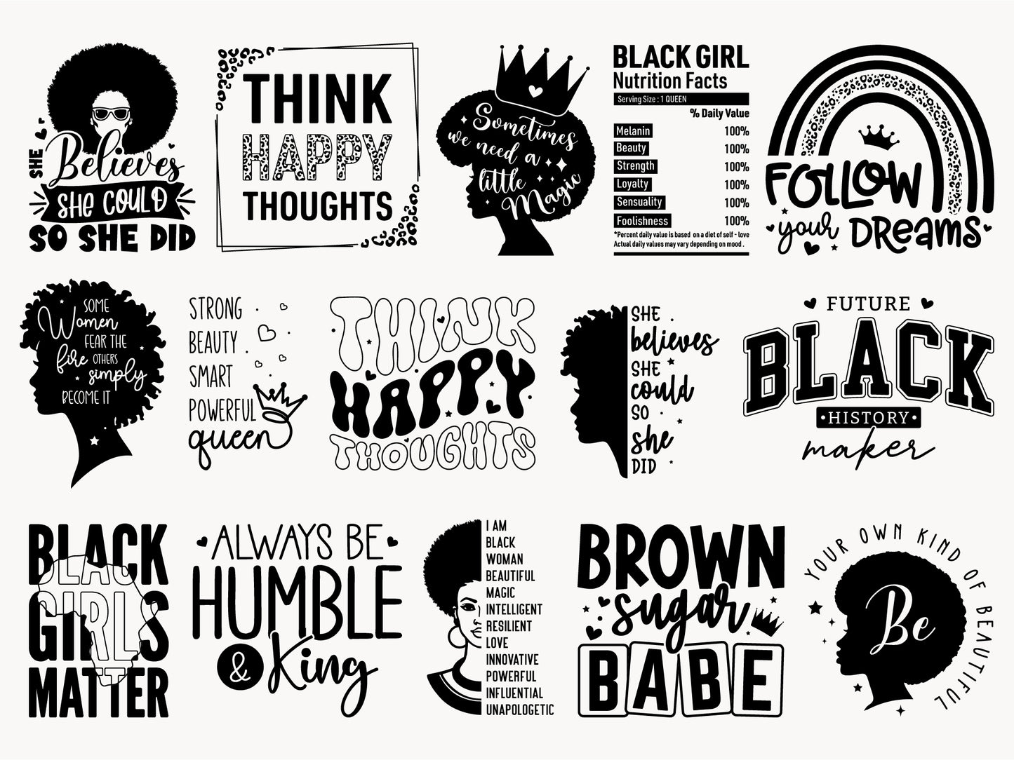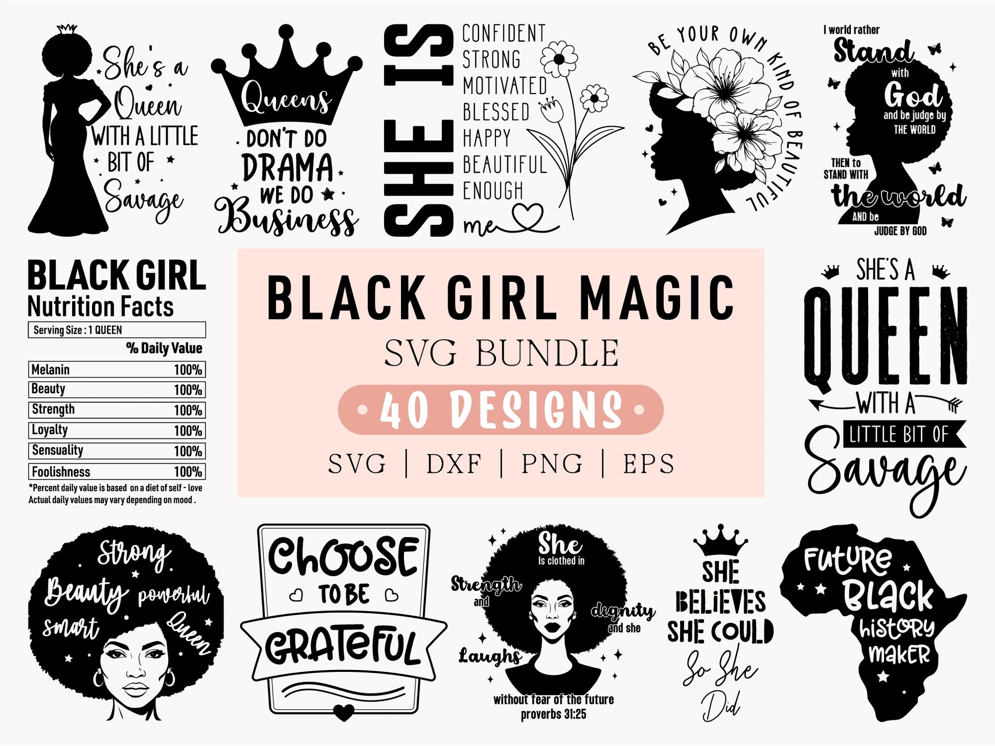 Check out our exclusive Black Girl Magic SVG Cut File Bundle! This stunning collection features 40 inspiring designs perfect for African American Black women and girls. Whether you're crafting t-shirts, mugs, tote bags, or home decor, this bundle offers endless creative possibilities. Each design is available in SVG, DXF, PNG, and EPS formats that are compatible with Cricut, Silhouette, Vinyl, and other cutting machines without any issues. From elegant Black Girl Afro graphics to motivational quotes, you'll get everything you need. Ideal for African American Girl projects, these designs are suited for creating thoughtful gifts, empowering apparel, or inspiring decor. Elevate your crafting game with this unique Black Girl Magic SVG Bundle.