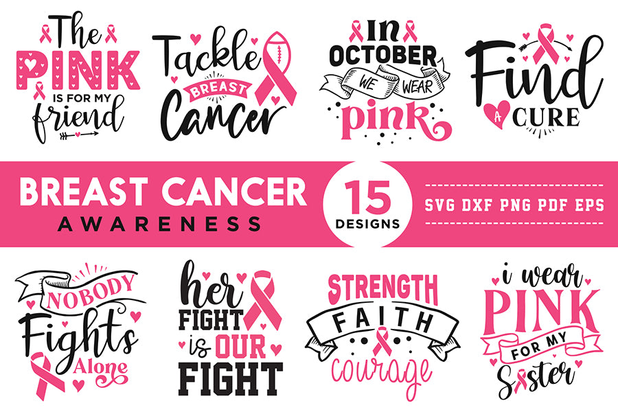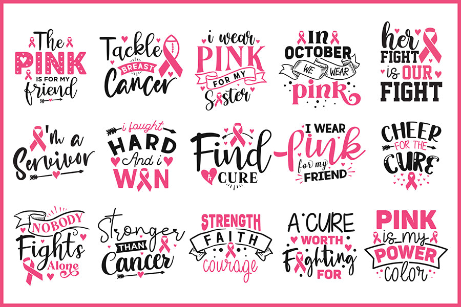 Discover the Breast Cancer SVG Bundle - a curated collection of 15 high-quality designs. Create personalized items that spread awareness and positivity. Perfect for t-shirts, mugs, tote bags, pillows, and more!