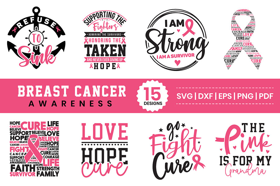 Make a powerful statement of support with our Breast Cancer SVG Bundle Vol-2. Access a collection of 15 inspiring designs to create impactful projects that raise awareness and inspire change. Perfect for creating t-shirts, mugs, tote bags, pillows, and more!