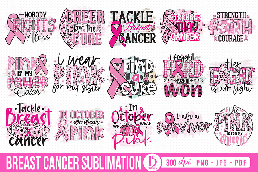 Introducing ‘Breast Cancer Sublimation Bundle’ – a unique collection of 15 designs, perfect for adding a touch of breast cancer to any project. These designs are ideal for creating t-shirts, mugs, tote bags, pillows, cards, and much more!