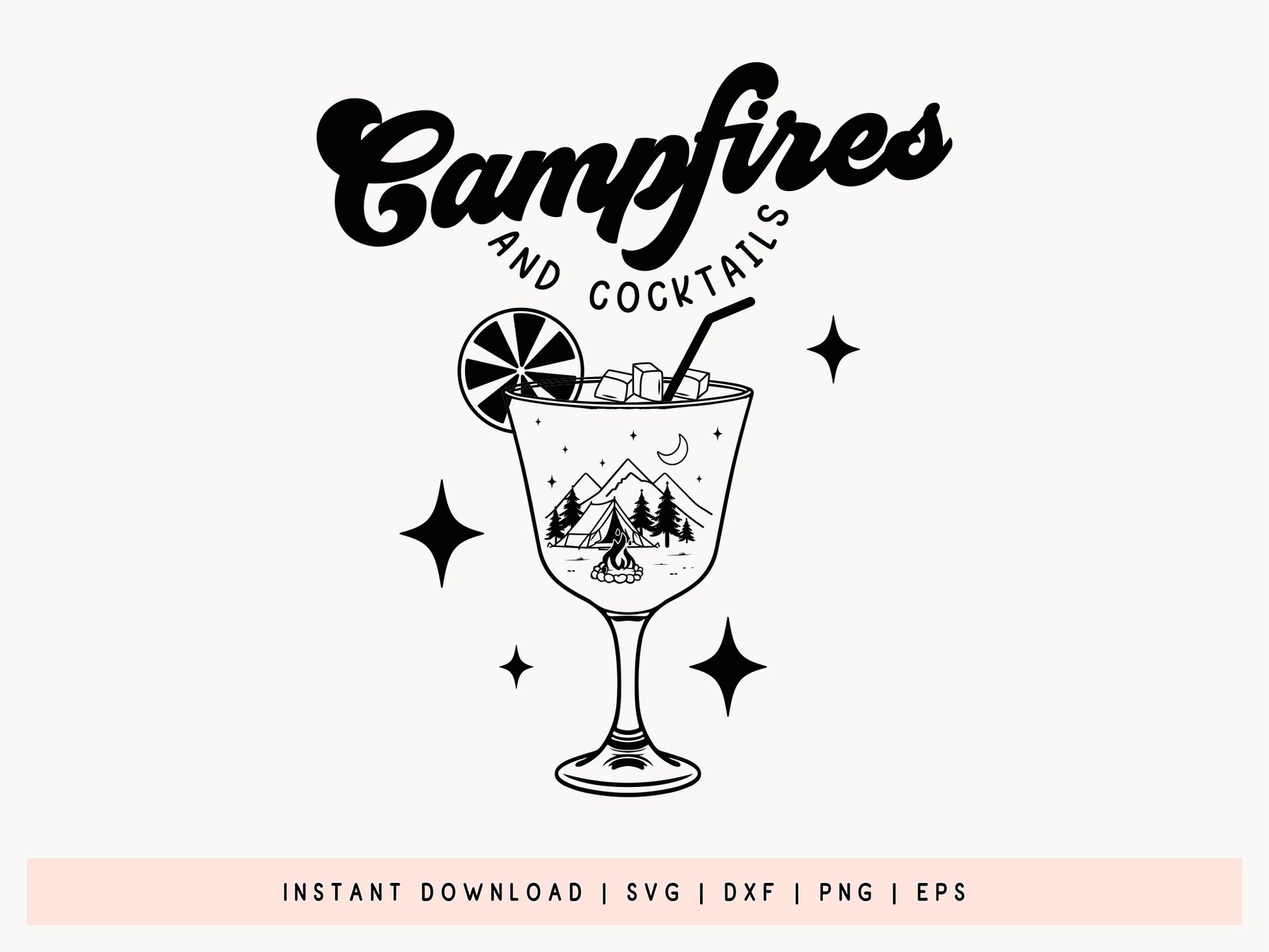 Look at our Campfires and Cocktails - Camping Quote SVG design that can be used for making crafts, apparel, and diy projects. This customizable camping SVG design is a dream come true for outdoor enthusiasts who cherish those cozy nights by the fire, sharing laughs with friends. Whether you're creating shirts, mugs, or signs, the camping SVG file will add a delightful touch to your projects. It's compatible with Cricut, Silhouette, and more, making it ideal to use and available in SVG, DXF, EPS, and PNG formats. This humorous camping SVG is just right for gifts, camp-themed decorations, or your next crafting project. Bring your passion for nature and friendship to life with this unique outdoor SVG design!