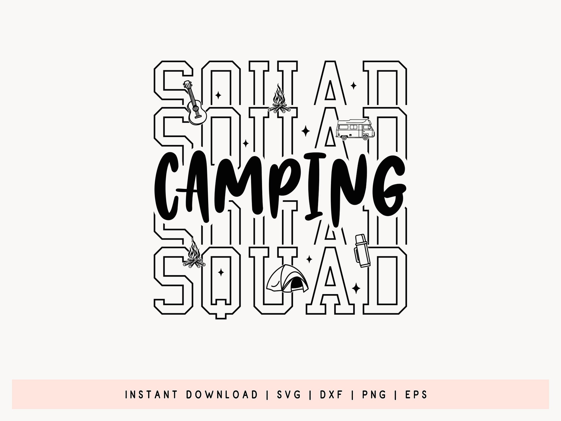 Discover the Camping Squad - Outdoor SVG Cut File, which is ideal for every joyful camper and nature enthusiasts! It’s the perfect option for anyone who enjoys the great outdoors. This high-quality camping SVG design adds a whimsical touch to your outdoor-themed crafts, whether you're creating amusing camping shirts, mugs, signs, or tote bags. The design is compatible with Cricut, Silhouette, and more, and comes in SVG, DXF, EPS, and PNG (300 dpi, transparent background) formats. If you're making personalized gear for your next adventure or unique camping-themed gifts, this cut file will bring a fun energy to your projects. Express your love for nature and adventure with the handcrafted outdoor SVG vector.