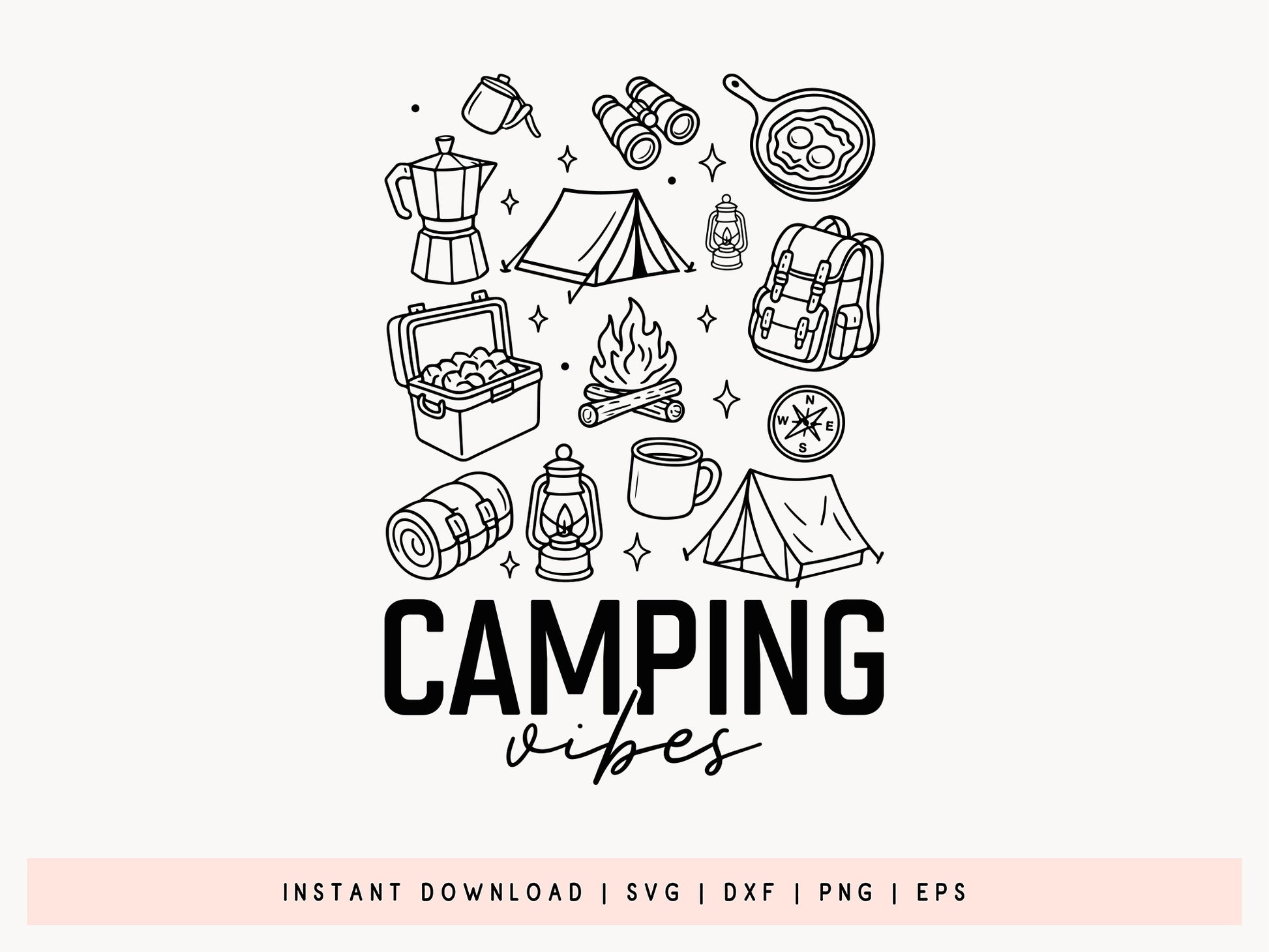 Browse the Camping Vibes SVG, DXF, EPS, and PNG file that's ideal for all you outdoor enthusiasts and adventure lovers! This design showcases a delightful mix of camping-themed icons, including fireworks, tents, bags, and so much more. It's a fantastic choice for crafting cozy apparel, mugs, tote bags, or even custom decor for your next camping getaway. Whether you're creating a fun camping-themed t-shirt or personalizing gear for family outings, this design brings a lovely touch of nature-inspired style. Besiedes, it comes with SVG, DXF, EPS, and PNG files, making it super easy to use with Cricut, Silhouette, and other cutting machines. Unleash your creativity with this outdoor SVG and add a bit of wilderness charm to your next creative projects!