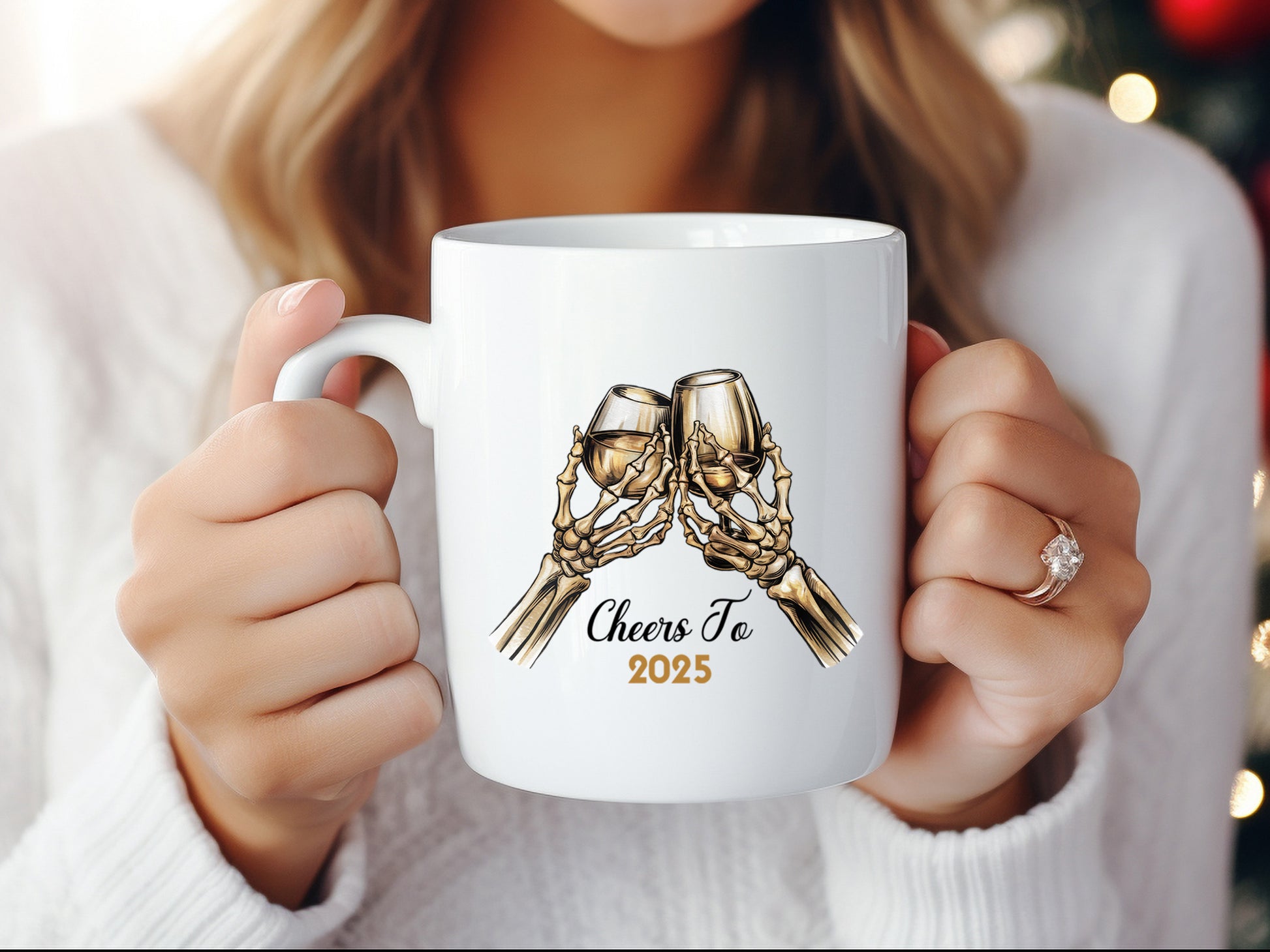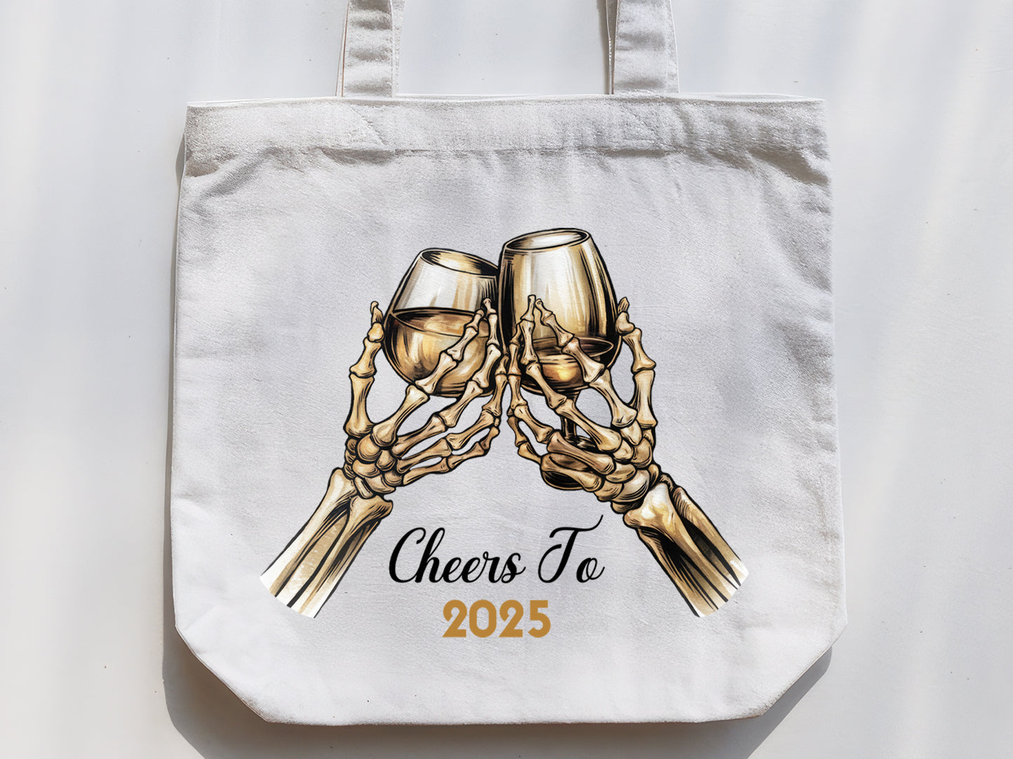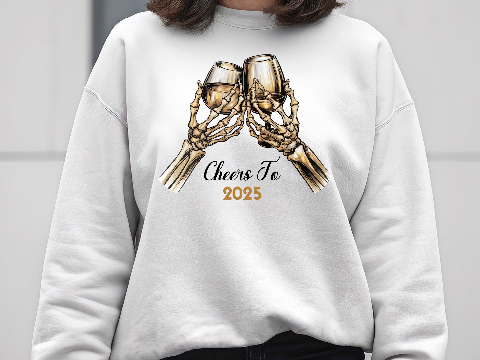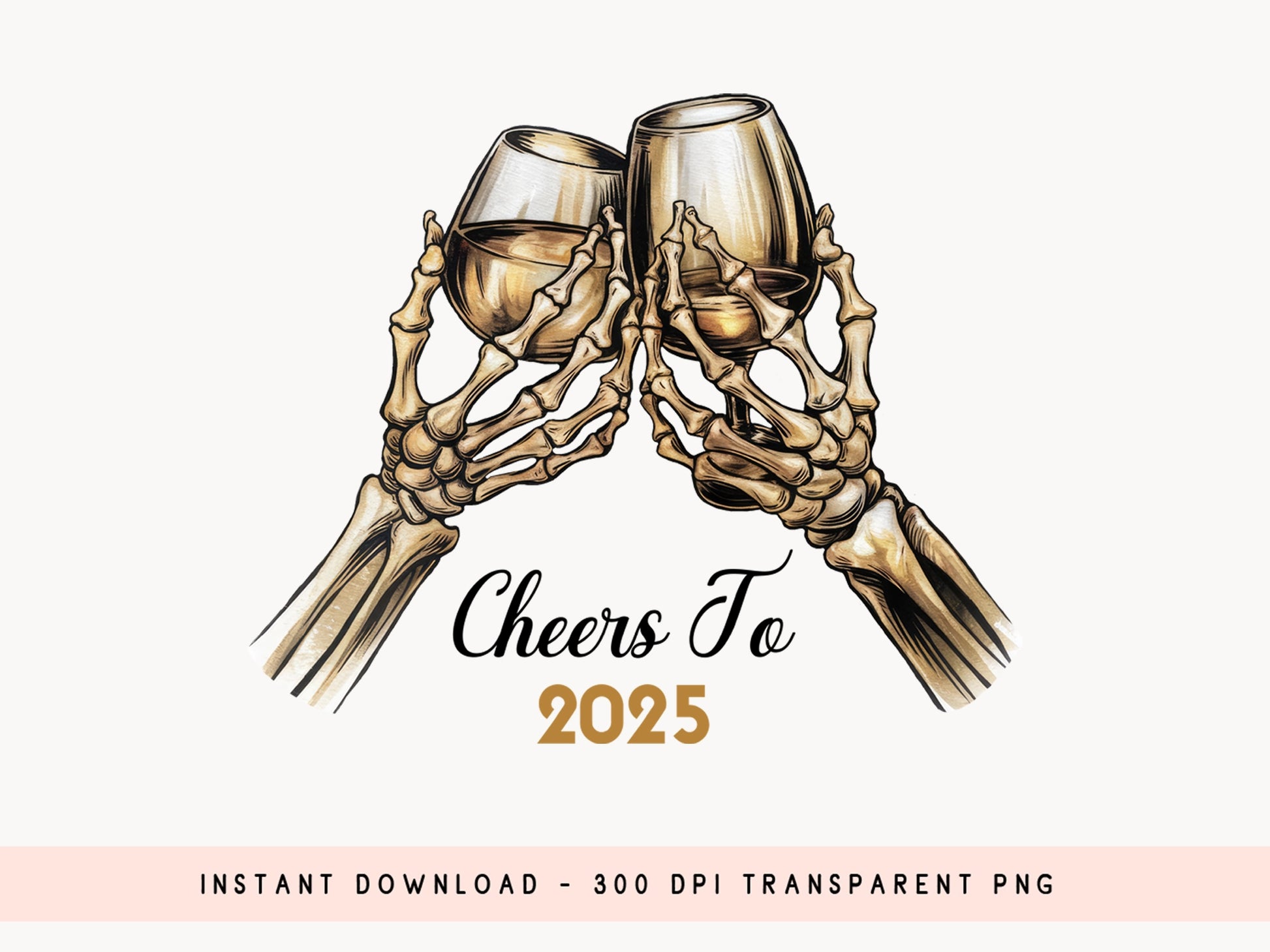 Buy the festive "Cheers to 2025 - New Year Sublimation PNG" design, perfect for New Year’s gatherings. This vibrant New Year Sublimation PNG is ideal for making t-shirts, mugs, champagne flutes, sweatshirts, and party décor. Featuring a pair of skeletal hands holding glasses of champagne and toasting to the new year. The high-quality PNG file offers vibrant colors, ensuring your sublimation projects stand out with a professional finish. Whether creating memorable gifts, it is an uplifting choice for you. Raise a glass and let the celebrations begin with this fun, festive "Cheers to 2025" design! Explore now.