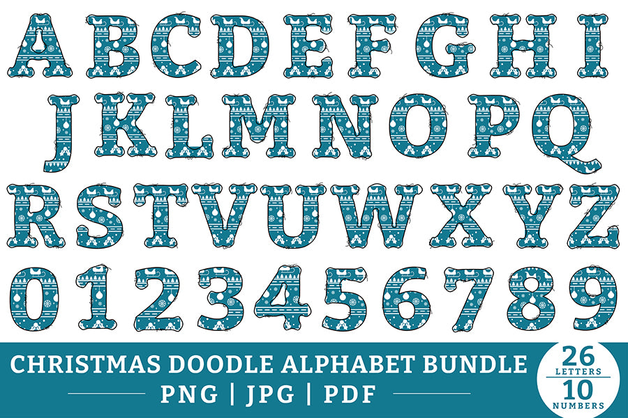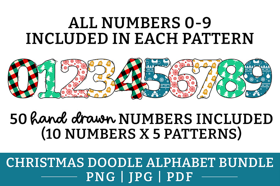 Christmas Doodle Alphabet and Numbers Sublimation Bundle features 200 designs. Included designs are doodle letters and numbers in five different patterns which have been created by hand. Each pattern contains 26 letters and 10 numbers. Also included are 20 hand drawn doodle clip art add ons.