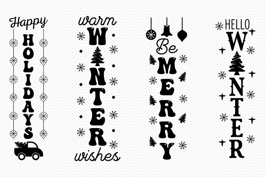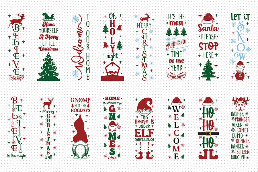 Create beautiful signs for your porch decor with this Christmas Porch Sign SVG Bundle Vol.2 – a unique collection of 20 creative designs, perfect for DIY holiday decorations. You can use them for porch / vertical signs, welcome signs, front door signs, outdoor decor, and more.
