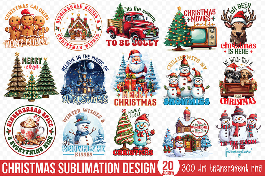 Create memorable holiday gifts and decor using our ‘Christmas Sublimation Bundle Vol 4’. A unique collection of 20 vibrant and festive designs perfect for adding a touch of Christmas to any project. You can use them for anything such as t-shirts, mugs, tote bags, pillows, hoodies, cards, and more!