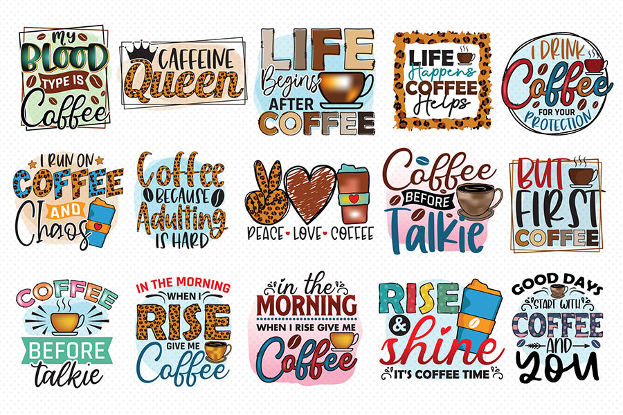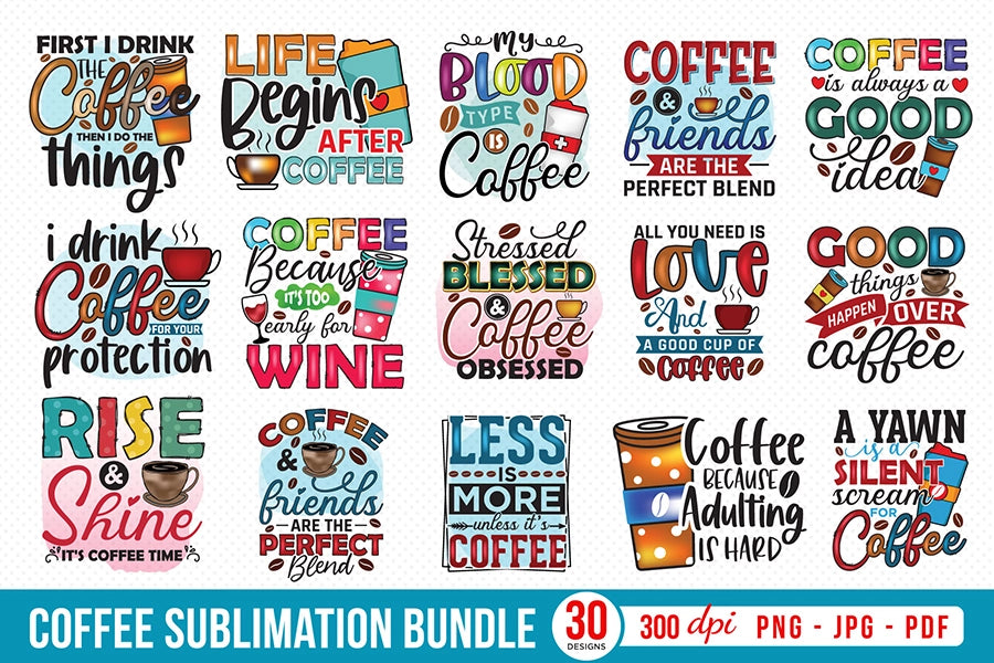 Check out our Coffee Sublimation Designs Bundle, the perfect collection for coffee enthusiasts and crafters. This top-notch bundle features 30 vibrant, professionally crafted PNG files at 300 DPI with transparent backgrounds. These eye-catching designs are perfect for mugs, tumblers, t-shirts, and so much more. Each design in the Coffee Sublimation Bundle showcases fun, beautiful quotes and hand drawn coffee-themed artwork that really brings your projects to life. Whether you’re crafting for yourself or making coffee-themed gifts, this bundle works seamlessly with all major printing and heat press systems. This Coffee Sublimation Bundle is user-friendly and packed with charm, making it a unique addition to your digital design library.