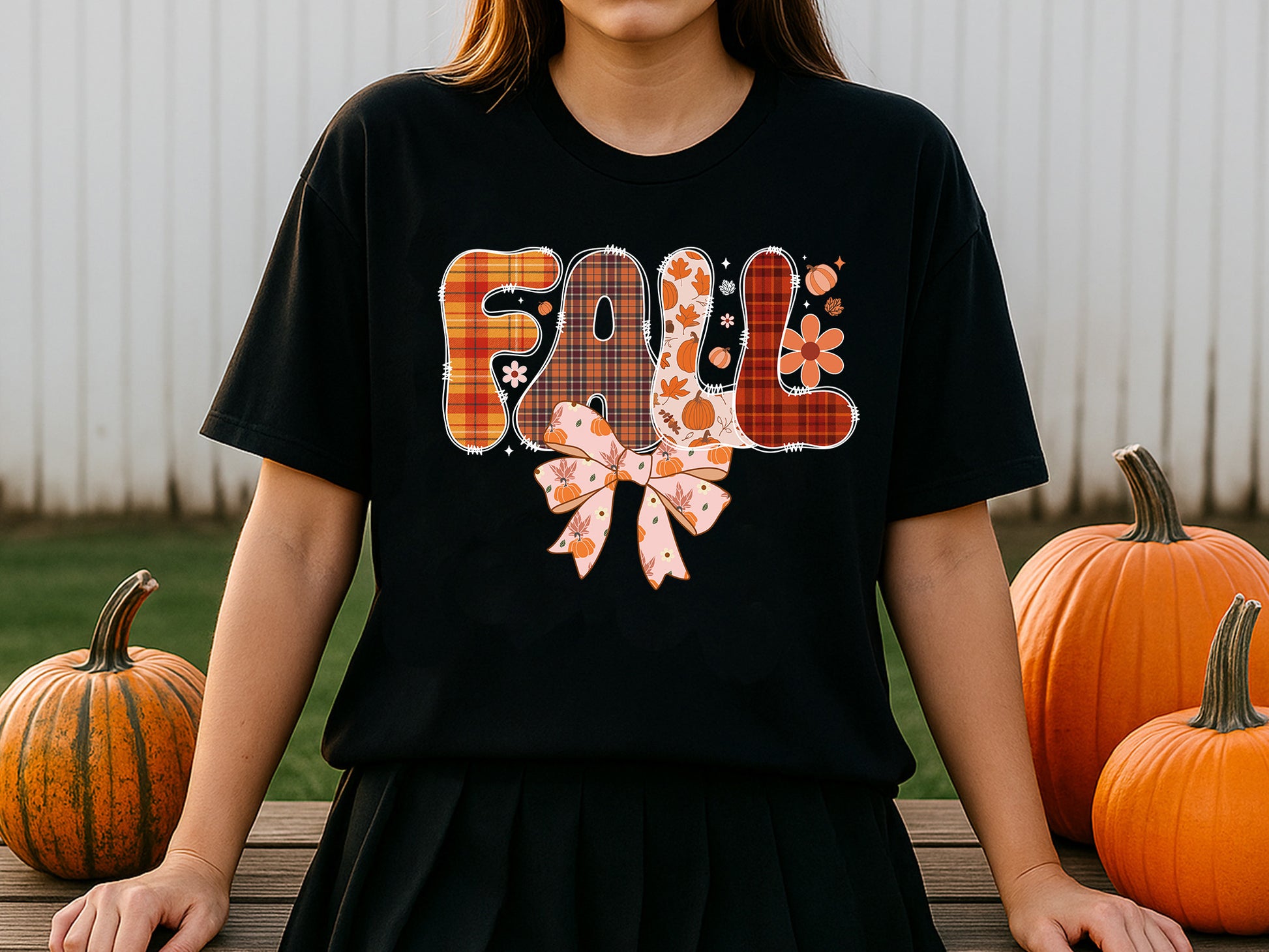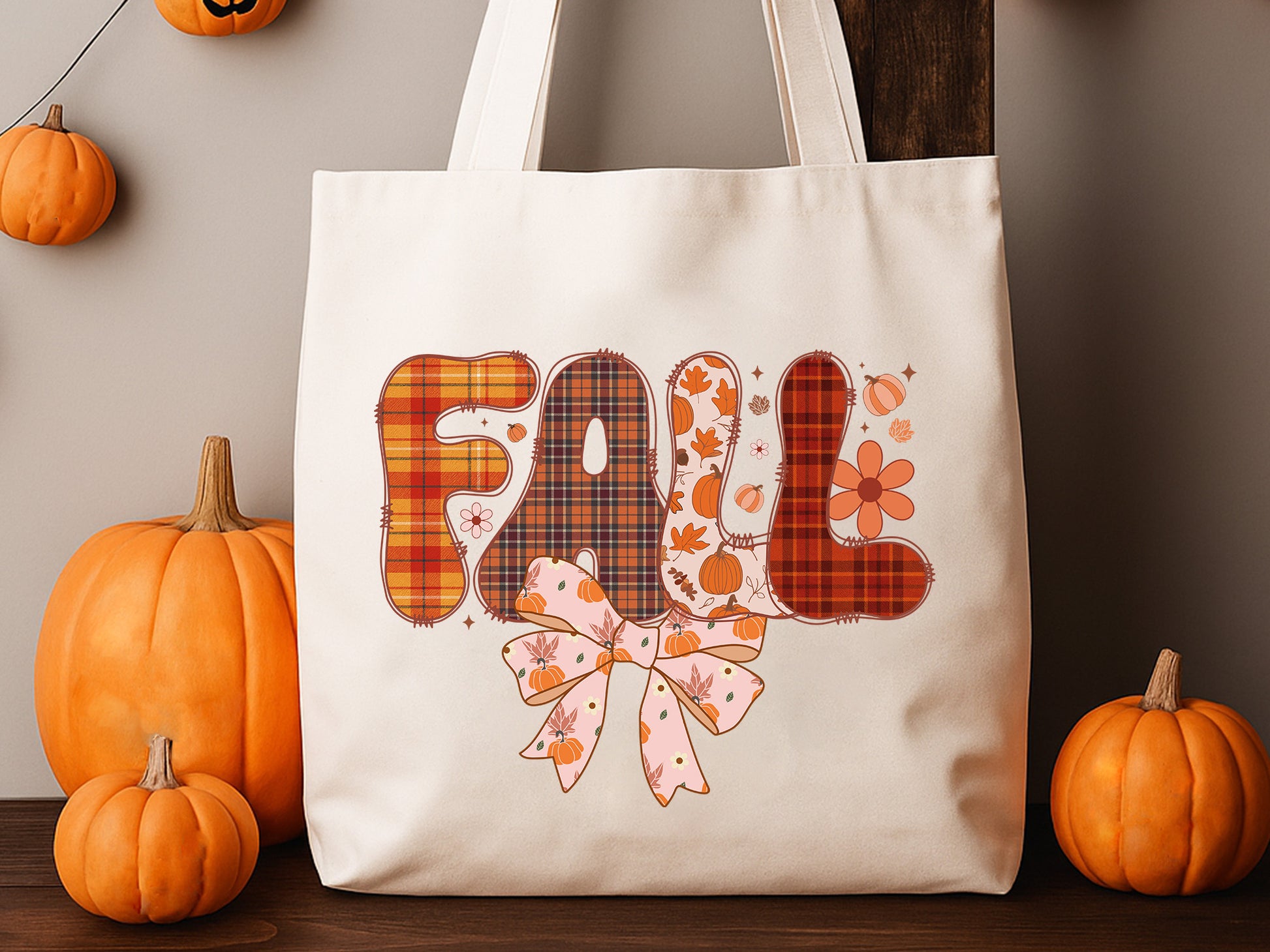 - Each letter has a unique autumn pattern: plaid, pumpkins, leaves, and checkers.