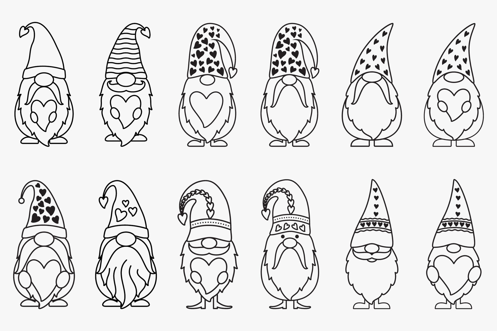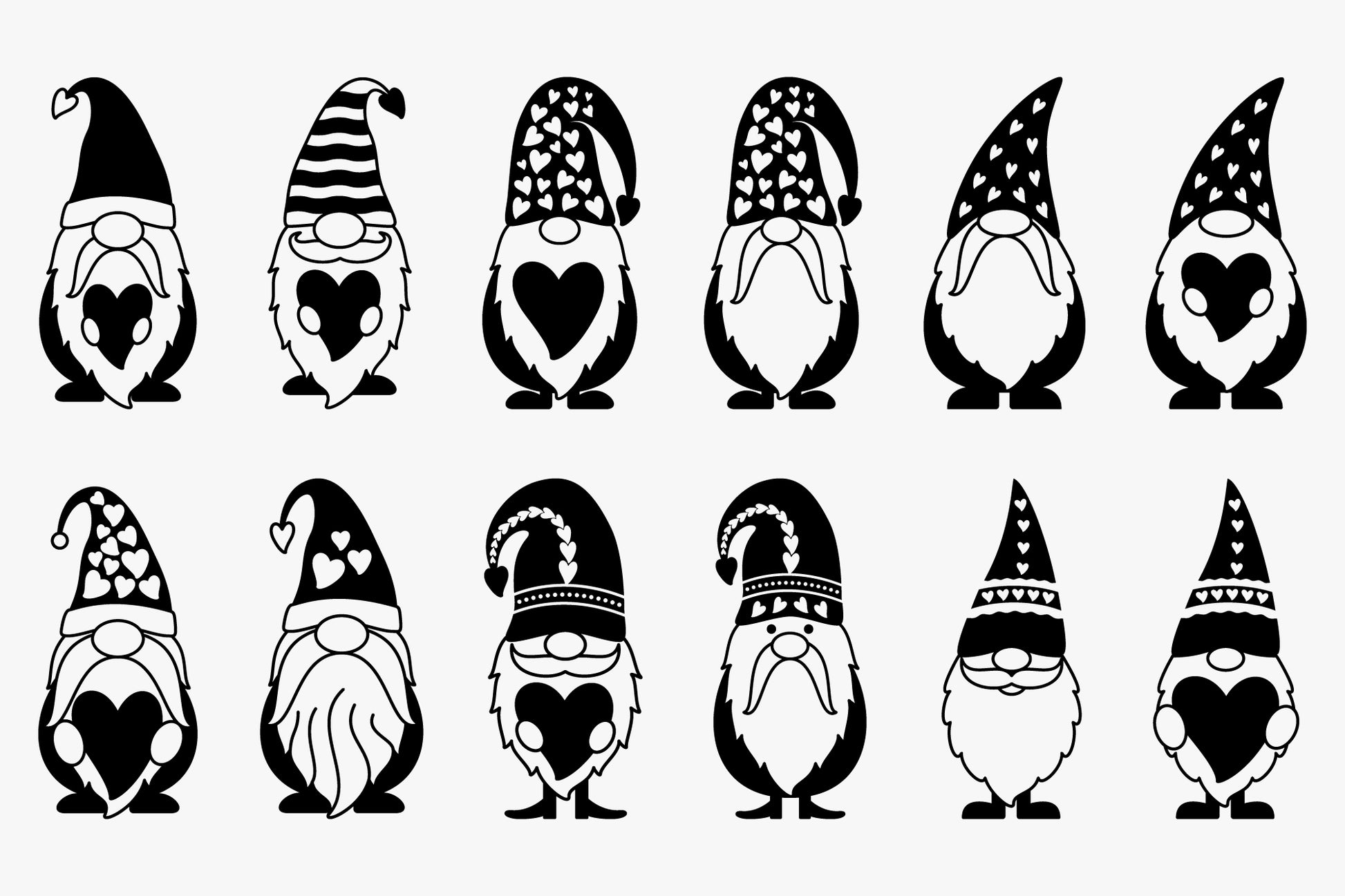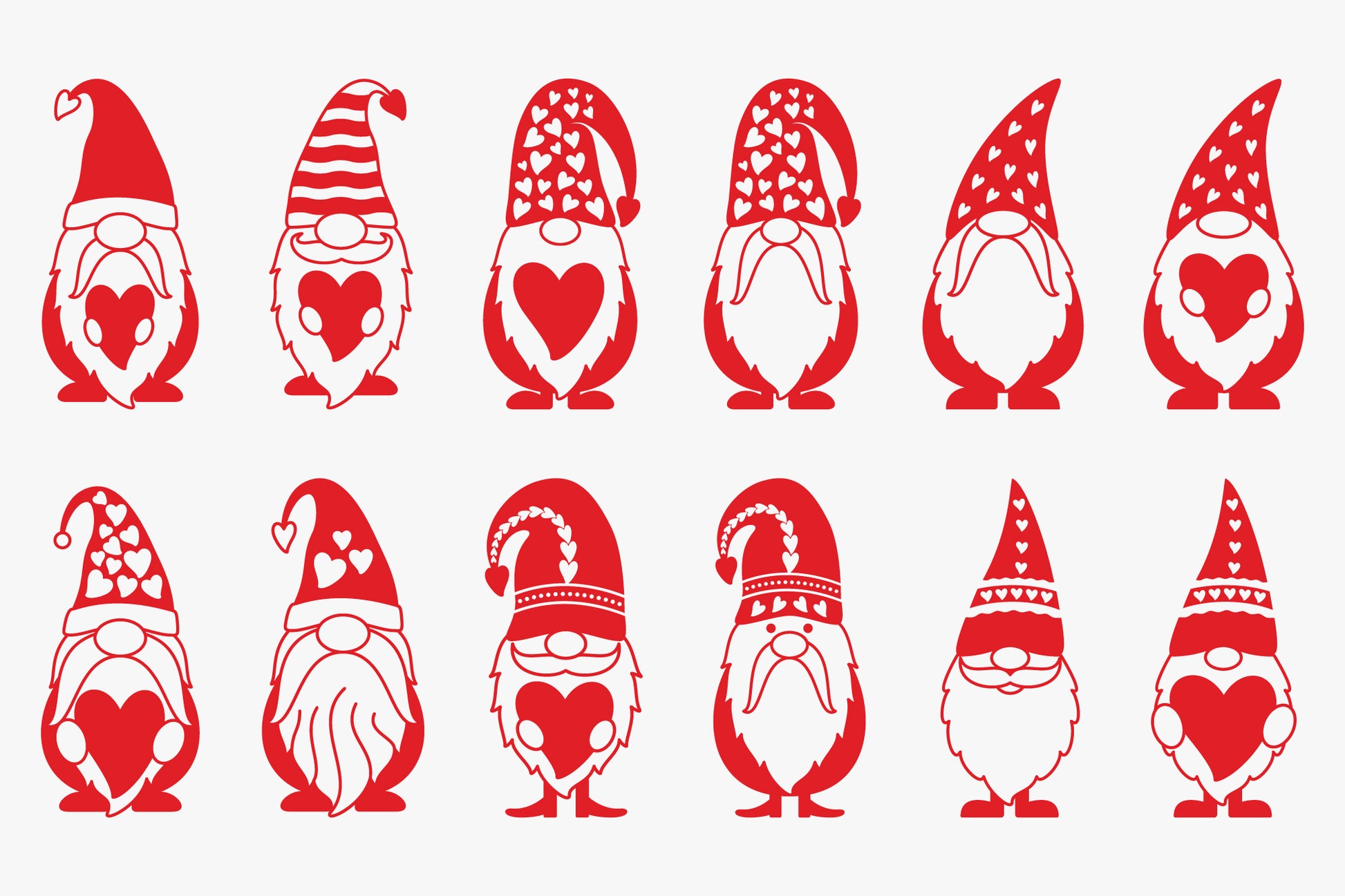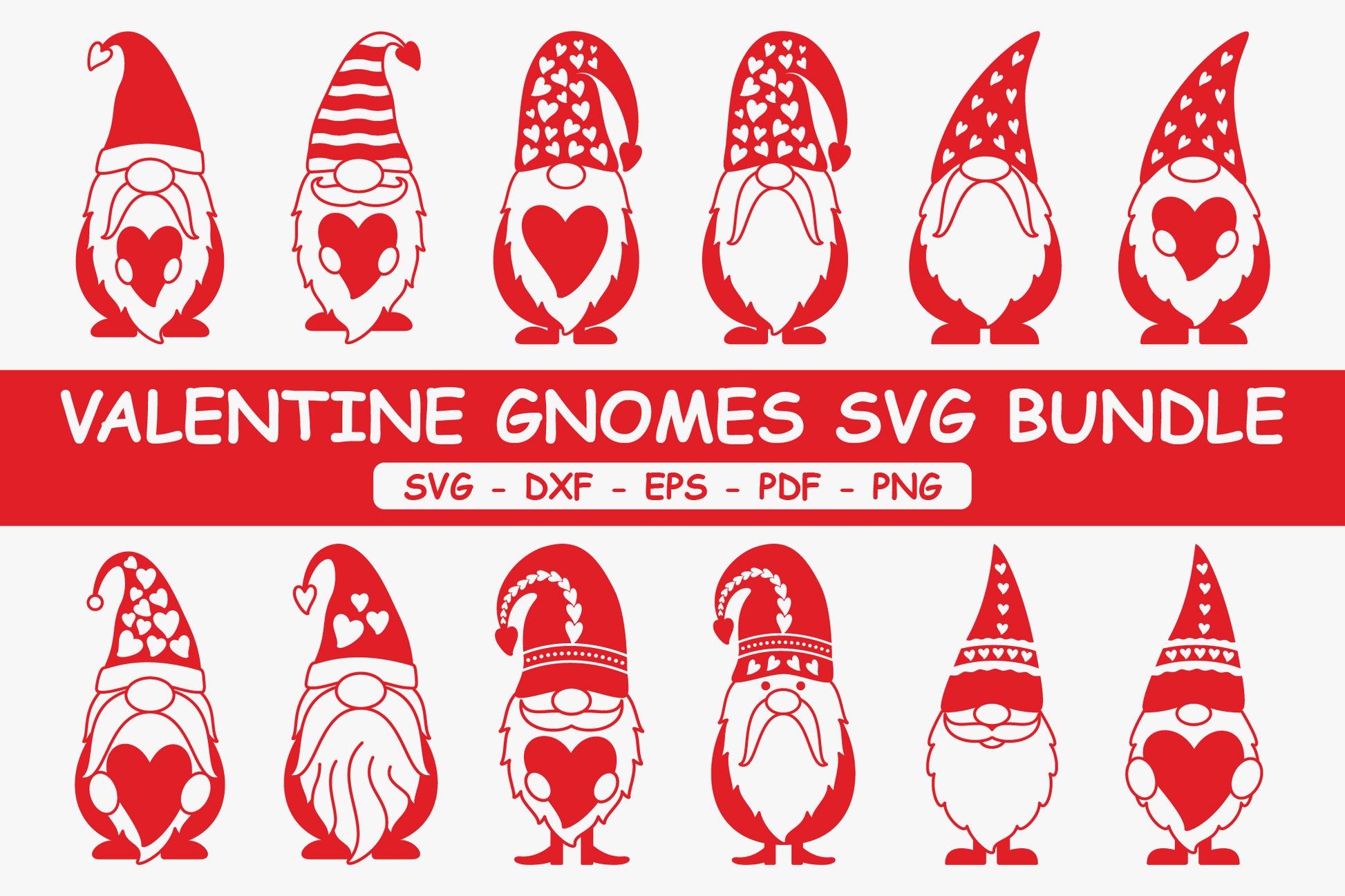 Get the Cute Valentine Gnomes Bundle SVG File, a creative collection of 20 lovable gnome characters in three versions including Black, color, and outline, perfect for your upcoming seasonal crafting needs. Use these high-quality SVG files to create unique designs for t-shirts, mugs, greeting cards, gift tags, home decor, and more. Whether you're crafting heartfelt gifts for loved ones or adding to your product line, these adorable gnomes will bring a playful, festive vibe to your every Valentine's Day project. All the designs in the bundle are available in different formats like SVG, DXF, PNG, EPS, and PDF that are suitable for Cricut, Silhouette, Vinyl, and other cutting machines.