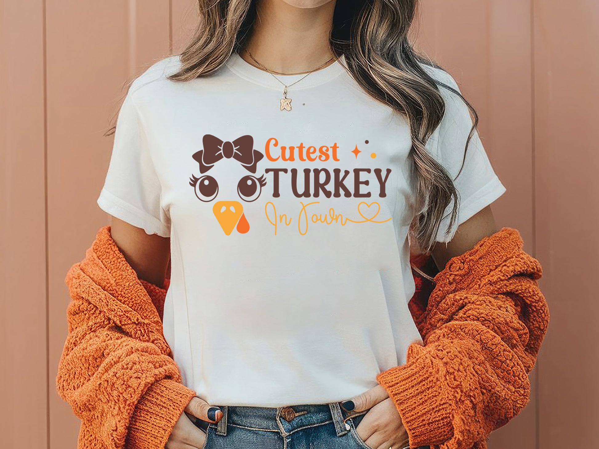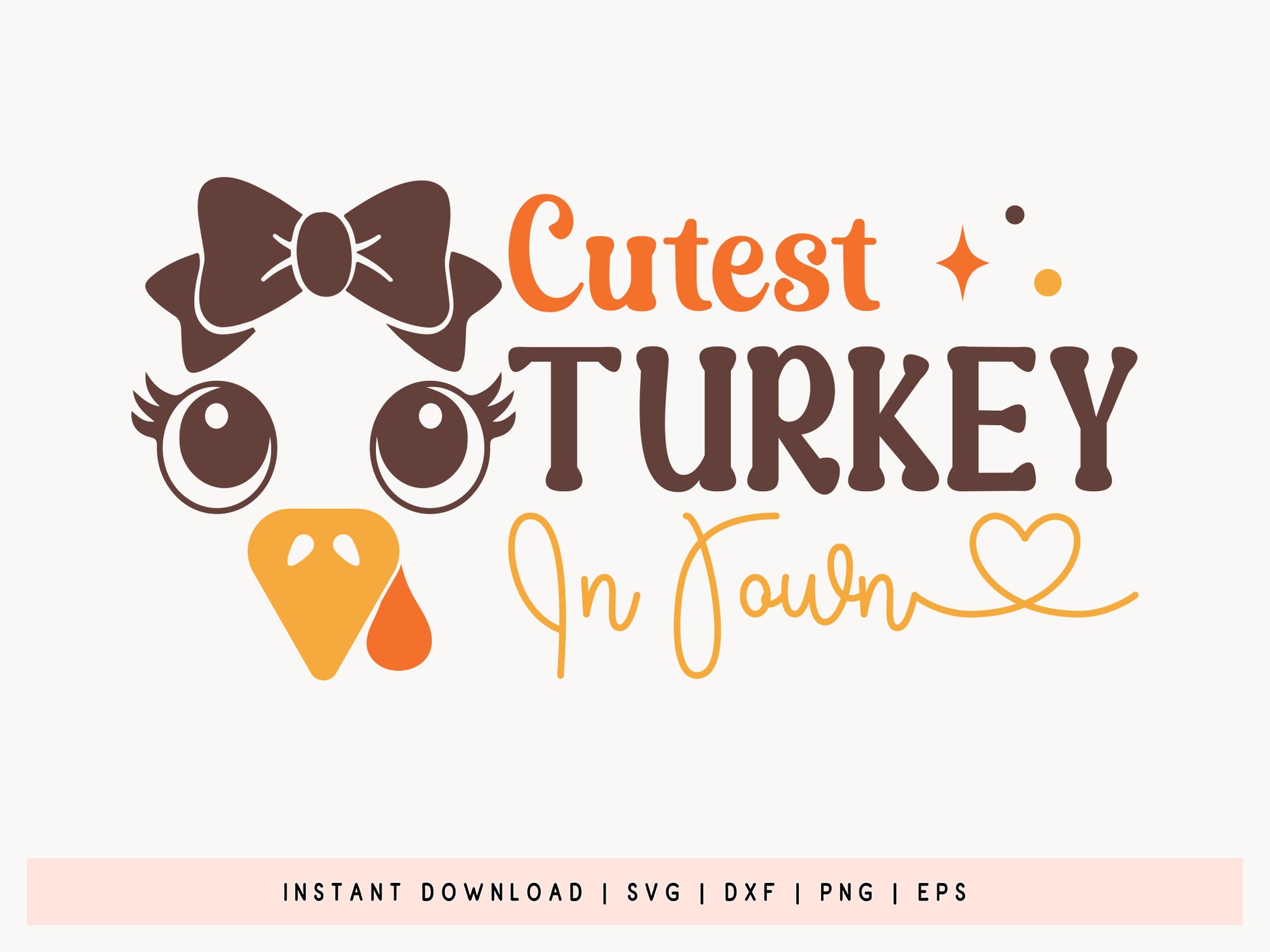 Buy our "Cutest Turkey in Town - Elegant Thanksgiving SVG" design, perfect for celebrating the holiday in style. It features a playful turkey face with the quote "Cutest Turkey in Town" that'll elevate your Thanksgiving projects. Ideal for crafting adorable t-shirts, baby onesies, signs, mugs, sweatshirts, and more. It adds a sweet and elegant touch to your DIY creations. This Elegant Thanksgiving SVG is versatile and easy to use for personalized gifts or holiday decor. Whether you’re dressing up the little ones or adding a stylish flair to your Thanksgiving celebrations, It is sure to be a crowd-pleaser. Browse now!