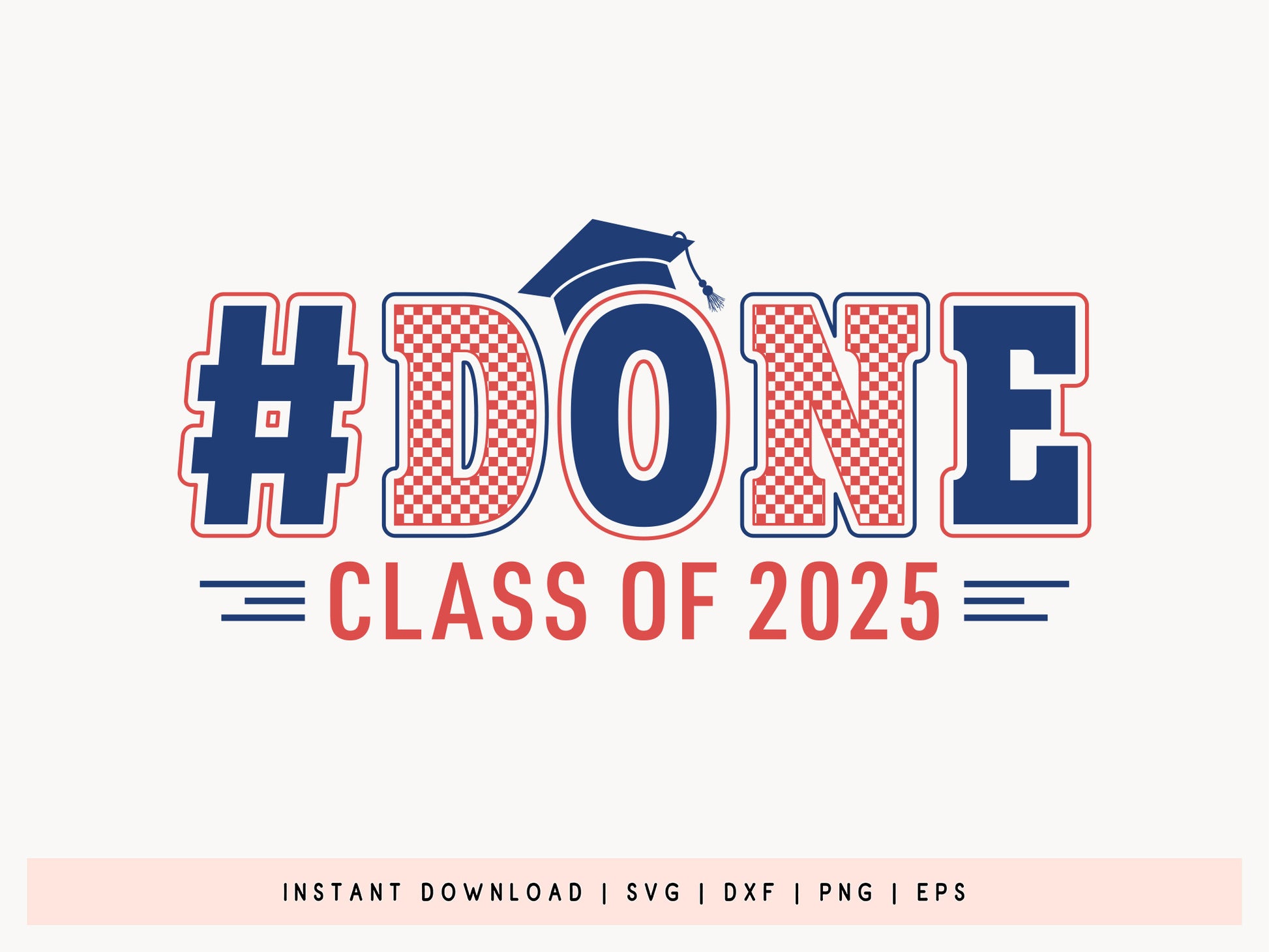 Celebrate your graduation milestone in style with our Done Class of 2025 - Graduation SVG! This trendy design is just what seniors need to proudly commemorate their big achievement. It's fully customizable, so you can easily add your school colors or class mottos, making your project truly unique. Our Graduation SVG is perfect for crafting shirts, banners, signs, mugs, and more. The design is available in SVG, DXF, EPS, and PNG formats, and it works flawlessly with Cricut, Silhouette, and other cutting machines. Whether you're putting together something special for a graduation party, a senior gift, or a custom keepsake, this Graduation SVG is the perfect choice. Add this Graduation SVG to your collection and start creating memorable, personalized projects today! Discover now.