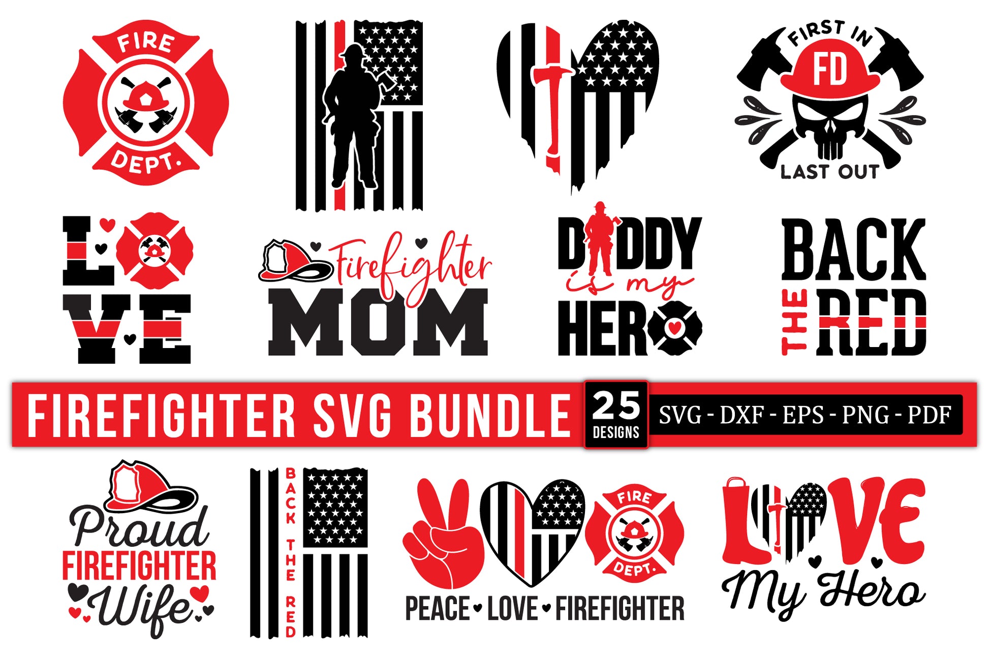 Check out our handmade Firefighter SVG Designs Bundle! The bundle includes 25 unique and creative designs that are perfect for honoring firefighters through meaningful projects. You’ll get SVG, DXF, EPS, PDF, and PNG files, making it super easy to use with various cutting machines and design software. Whether you’re making firefighter-themed shirts, mugs, wall art, or special gifts, our Firefighter SVG Bundle has everything you need. From handmade graphic illustrations to motivational quotes, these designs can be fully customized to match your personal flair. Perfect for creating unique firefighter gifts and apparel, this Firefighter SVG Bundle is a dream come true for DIY lovers and anyone looking to celebrate their local heroes.