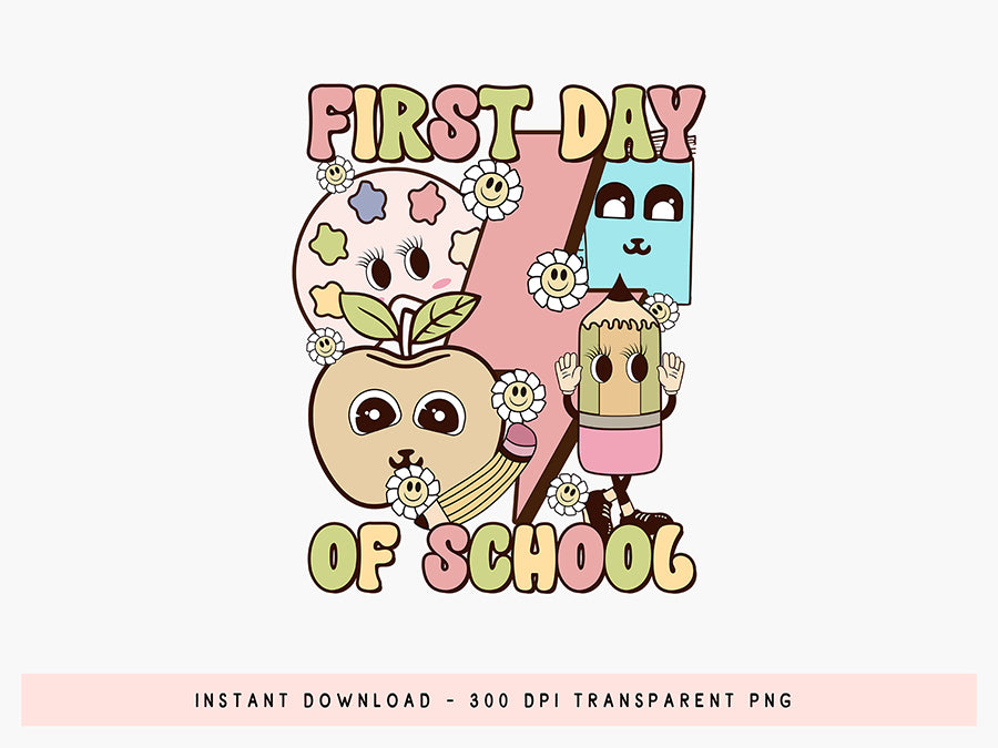 Discover this charming "First Day of School - Groovy Back to School PNG" design, a perfect way to commemorate the start of a new school year. Ideal for creating personalized t-shirts, tote bags, home decor, and more. Whether you're shopping for your own child or looking for a thoughtful gift, this "First Day of School" design offers endless possibilities to commemorate the first day back. This is a digital download in high-resolution PNG file. You can t-shirts, mugs, tote bags and much more with Groovy Back to School PNG. Shop today and start designing back-to-school projects!
