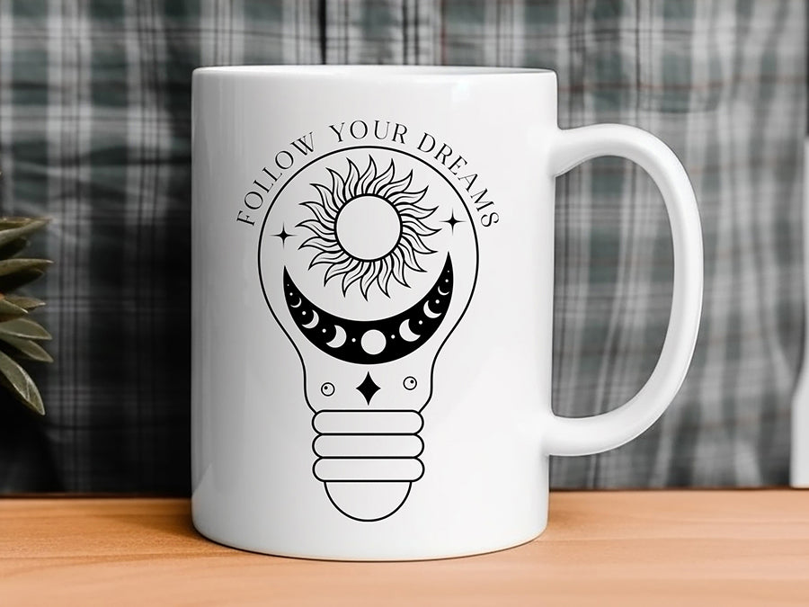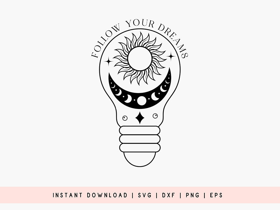 Check out our elegant Boho SVG design, an instant download file that features a light bulb with a sun and moon inside of it. There is text above the light bulb that reads "Your Dreams Follow". This "Follow Your Dreams" design can be used with cutting machines, such as Cricut or Silhouette, to create a multitude of projects. You can print this design on your physical products as gifts or sell the products you printed such as t-shirts, mugs, tote bags, pillows and much more. Take the "Follow Your Dreams - Boho SVG Design" today!