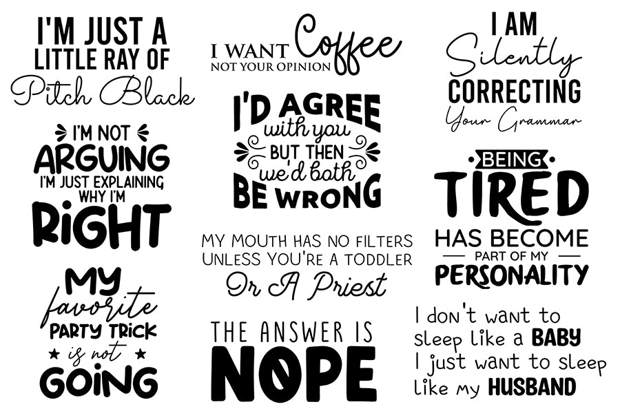 Get the Funny Quotes SVG Bundle, a curated selection of 25 hilarious designs, perfect for anyone looking to add a touch of humor to their creative projects. Create personalized gifts, crafts, apparel and accessories with these sarcastic designs. Whether you're a graphic designer, crafter, or small business owner, this bundle is versatile and add a touch of wit and charm to your artwork. You can print physical items or sell the items you print such as t-shirts, mugs, tote bags, pillows and more using this Funny Quotes SVG Bundle. Purchase now and start creating inducing designs.