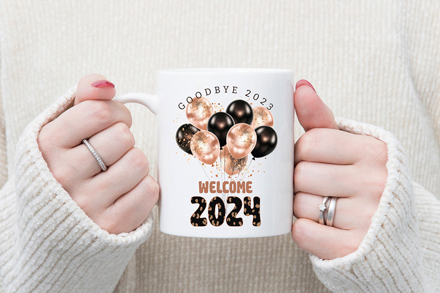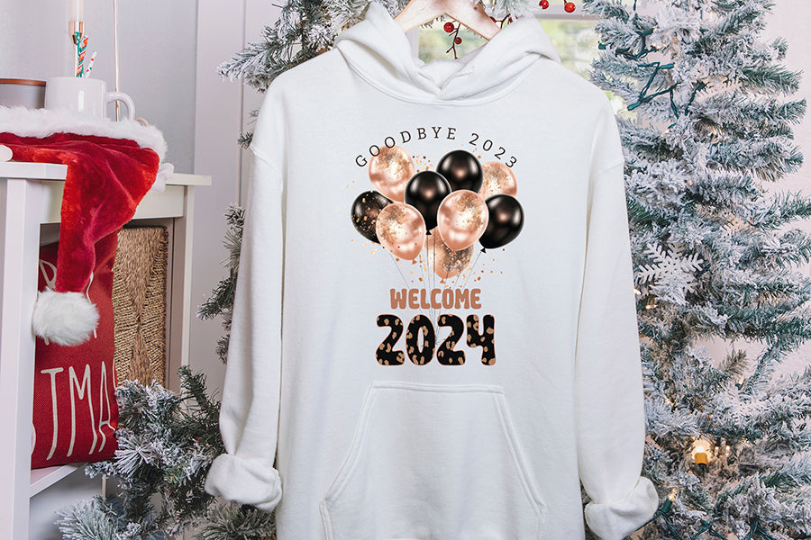 Create unique New Year's Eve projects & gifts to welcome the arrival of the New Year 2024. This high-quality design features festive balloon illustrations with 'Goodbye 2023 Welcome 2024' text. It’s perfect for making New Year Shirts, sweathers, t-shirts, mugs, hoodies, cards, tote bags, pillows, and much more!