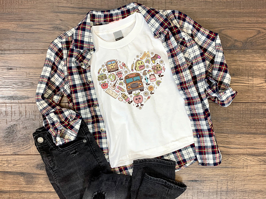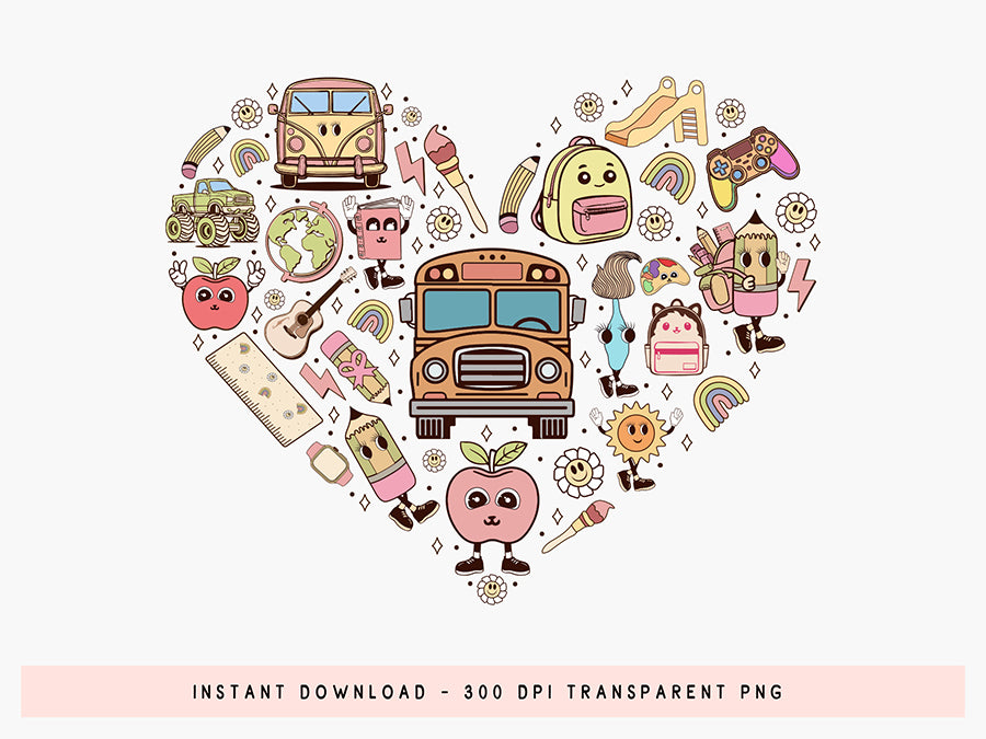 Explore the “Groovy Back to School Supplies sublimation" design! This vibrant design features a variety of school supplies such as pencils, books, rulers and more in a heart shape, perfect for adding a touch of fun to any back to school project. If you're a teacher looking to create engaging classroom decor, a parent seeking to add a personal touch to school-related items, or a designer in need of a unique graphic element, this Groovy Back to School Sublimation is a versatile option. You can print it on your physical products as gifts or sell the products you print such as t-shirts, mugs, tote bags and beyond. Buy now!