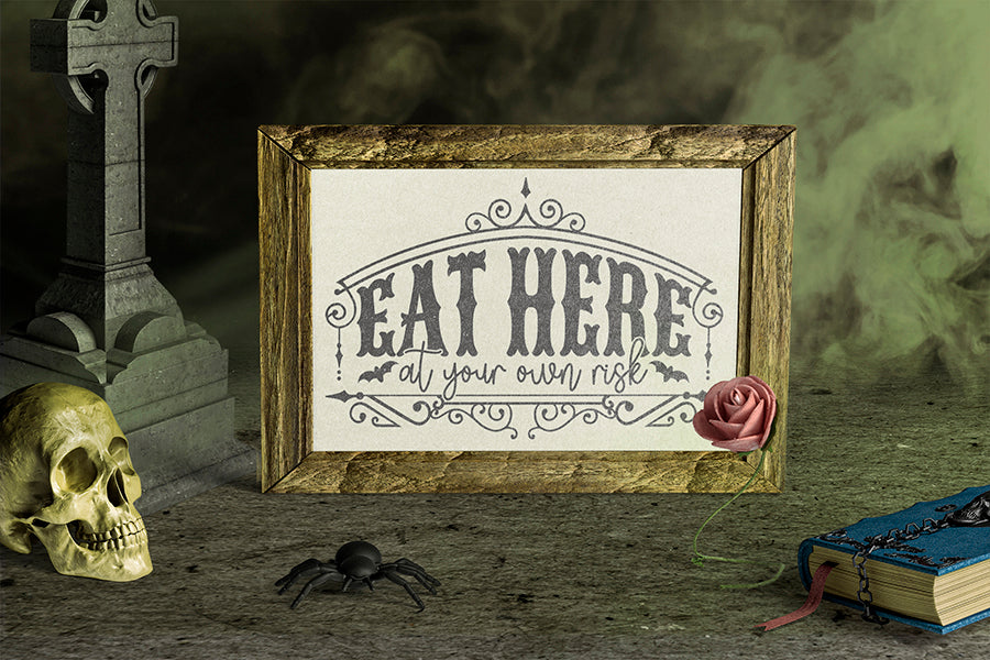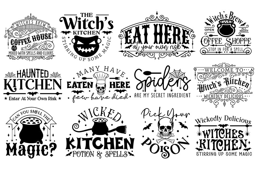 Get ready to add a spooky touch to your kitchen with this Halloween Kitchen Sign SVG Bundle. A unique collection of 20 creative designs which can be used for wooden signs, stencils, wall decals, kitchen decor, and much more!