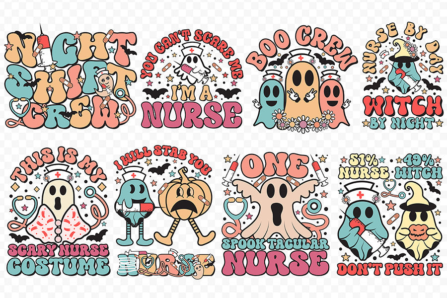 Introducing the Halloween Nurse Sublimation Bundle, a unique collection of 15 spooky and eye-catching designs, perfect for adding a touch of Halloween to any project. These are ideal for creating t-shirts, mugs, tote bags, pillows, and more!