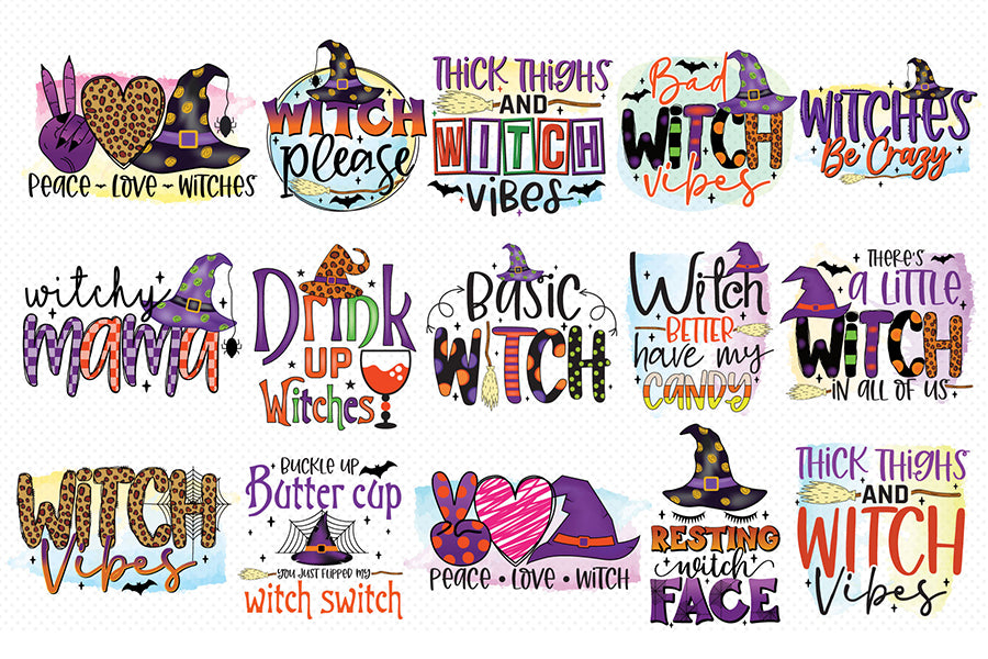 Discover the ultimate Halloween Witch Sublimation Bundle. This curated collection features 30 spooky designs, make them perfect to any halloween project. You can use these for creating t-shirts, mugs, tote bags, pillows, and more!