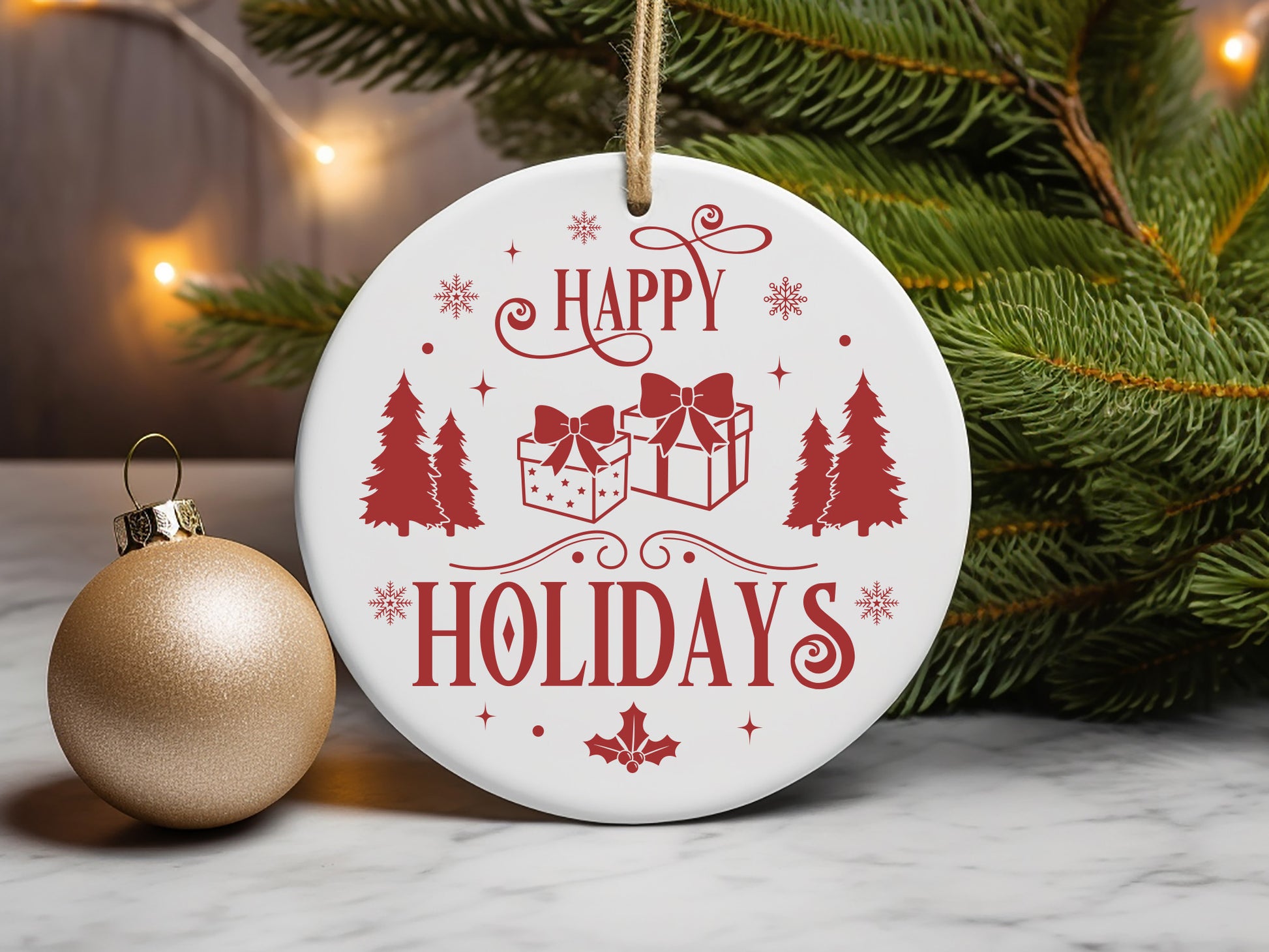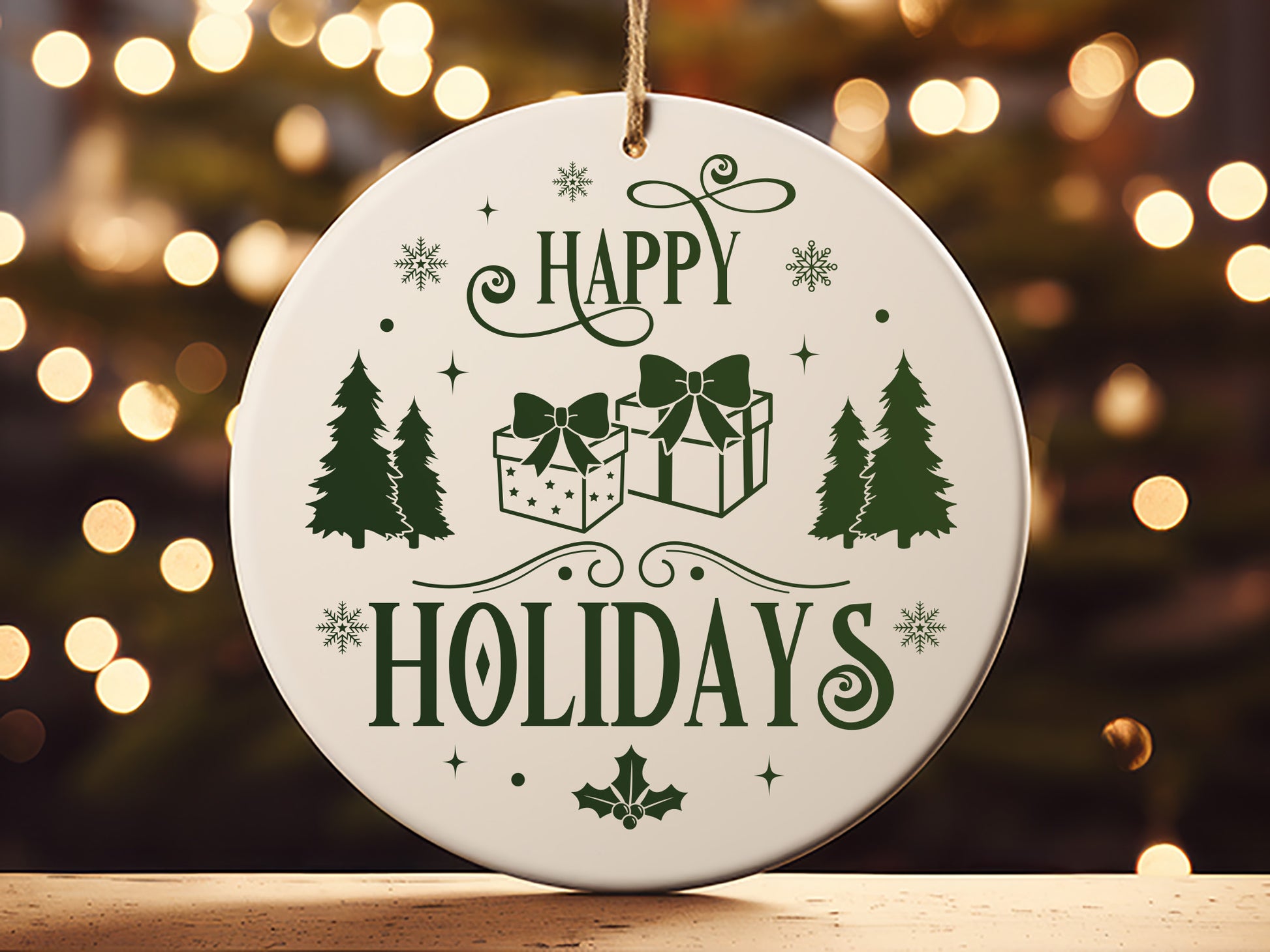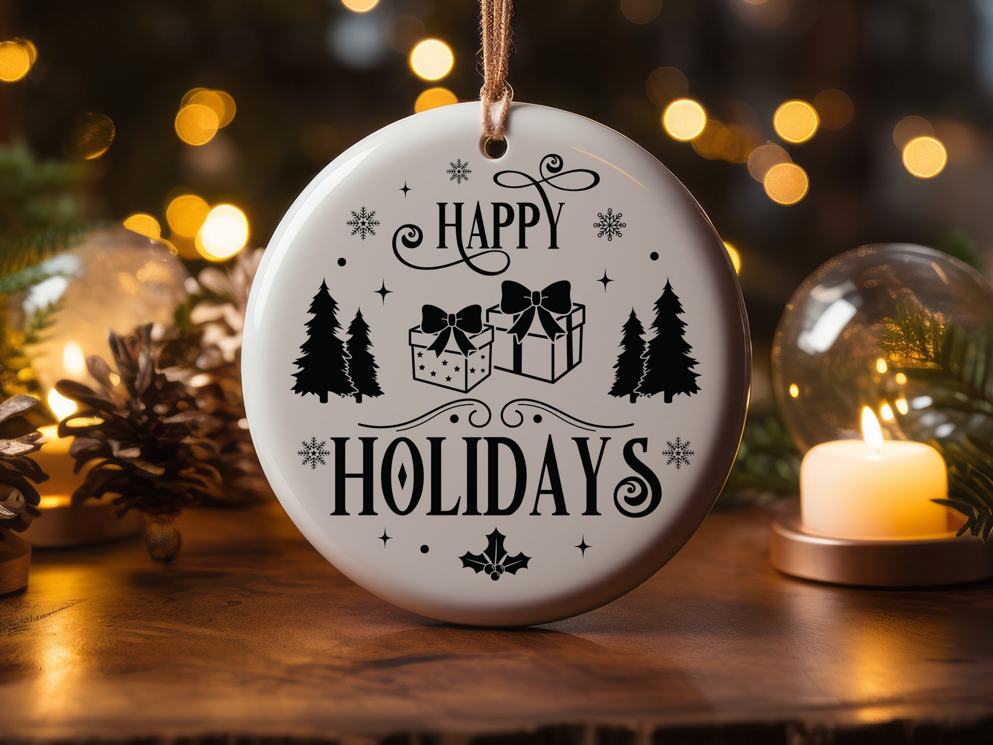 Explore our "Happy Holidays - Funny Christmas Ornament SVG, a high-quality, delightful design featuring "Happy Holidays" greeting surrounded by snowflakes, a decorative swirl, and two gift boxes, perfect for crafting beautiful Christmas ornaments. Whether you're decorating your tree, creating handmade gifts, or adding a personal touch to your holiday décor, this Funny Christmas SVG is easy to use with various cutting machines like Cricut and Silhouette. Bring joy and warmth to your seasonal projects with this charming, versatile design, making your holiday celebrations even more special. Download now and spread the festive cheer!