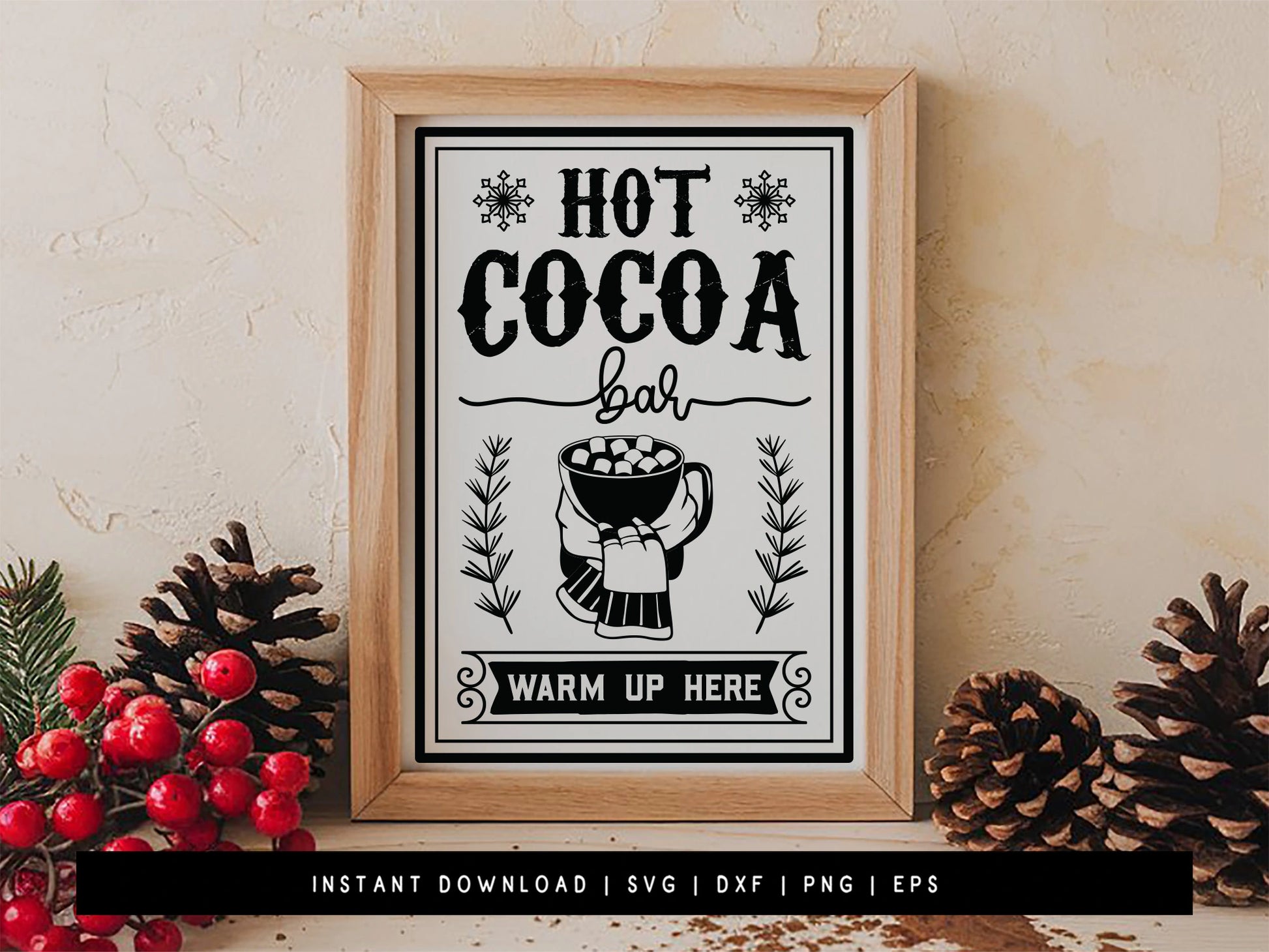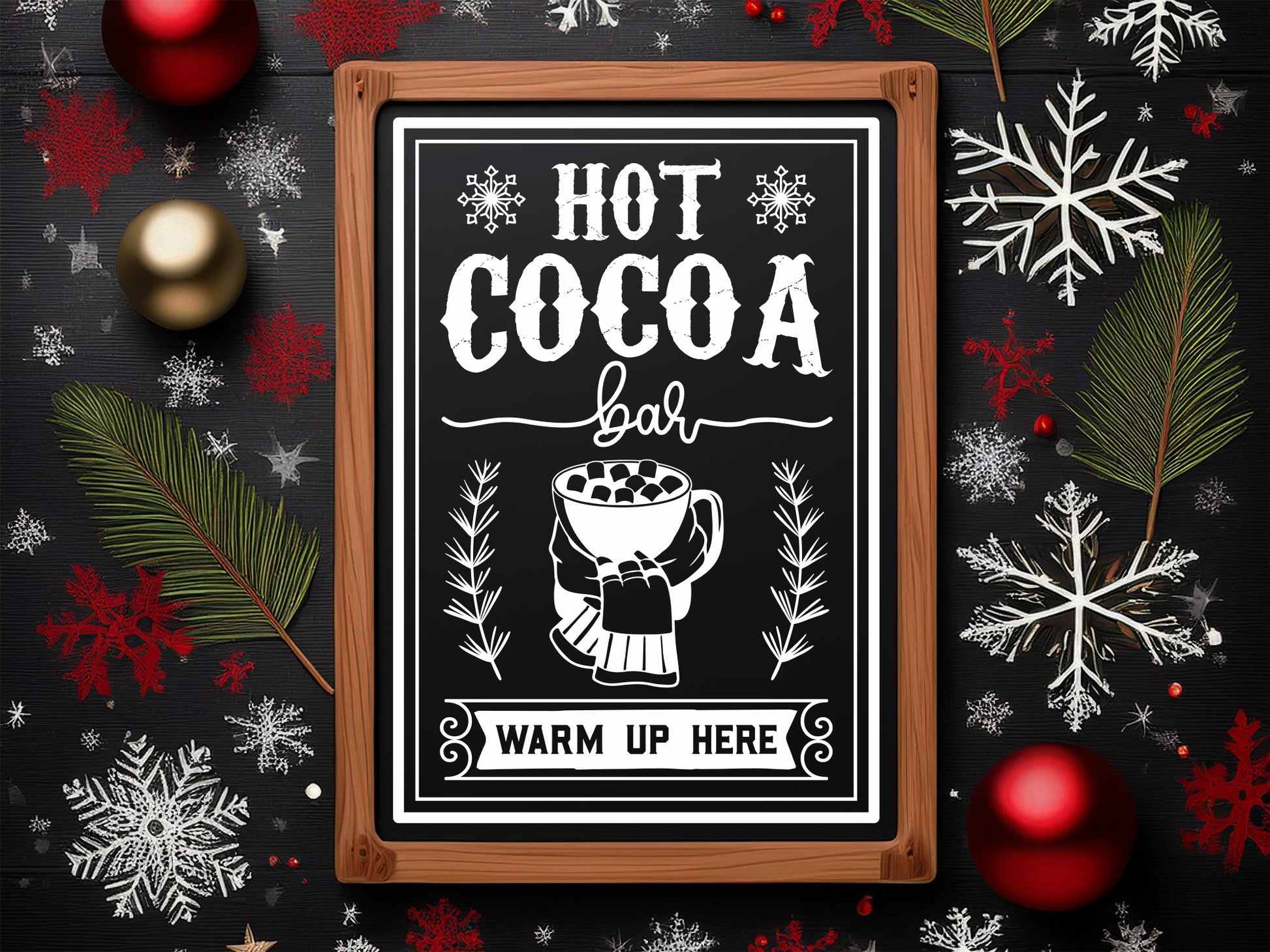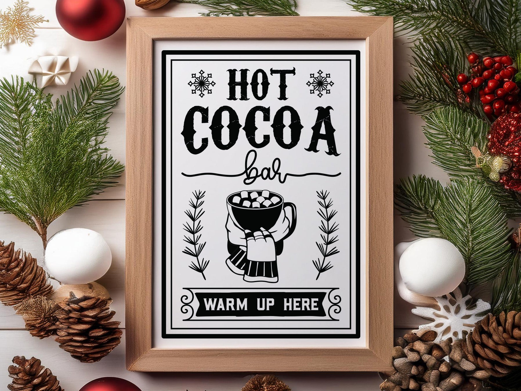 Discover our Hot Cocoa Bar Printable Sign SVG design, a unique and high-quality graphic ideal for adding a warm, welcoming touch to your hot cocoa station or bar. With its playful fonts and charming graphics, it’s perfect for crafting printable signs, framed decor, or even personalized winter-themed projects. This Hot Cocoa Bar Printable Sign SVG works easily with vinyl, Silhouette, Cricut and other cutters, allowing you to create on wood, glass, or fabric. Elevate your holiday decor with this inviting sign that says “hot cocoa bar warm up here”. Whether for your home or as a thoughtful gift, this printable design is the perfect addition to any cocoa lover’s space! Get now.