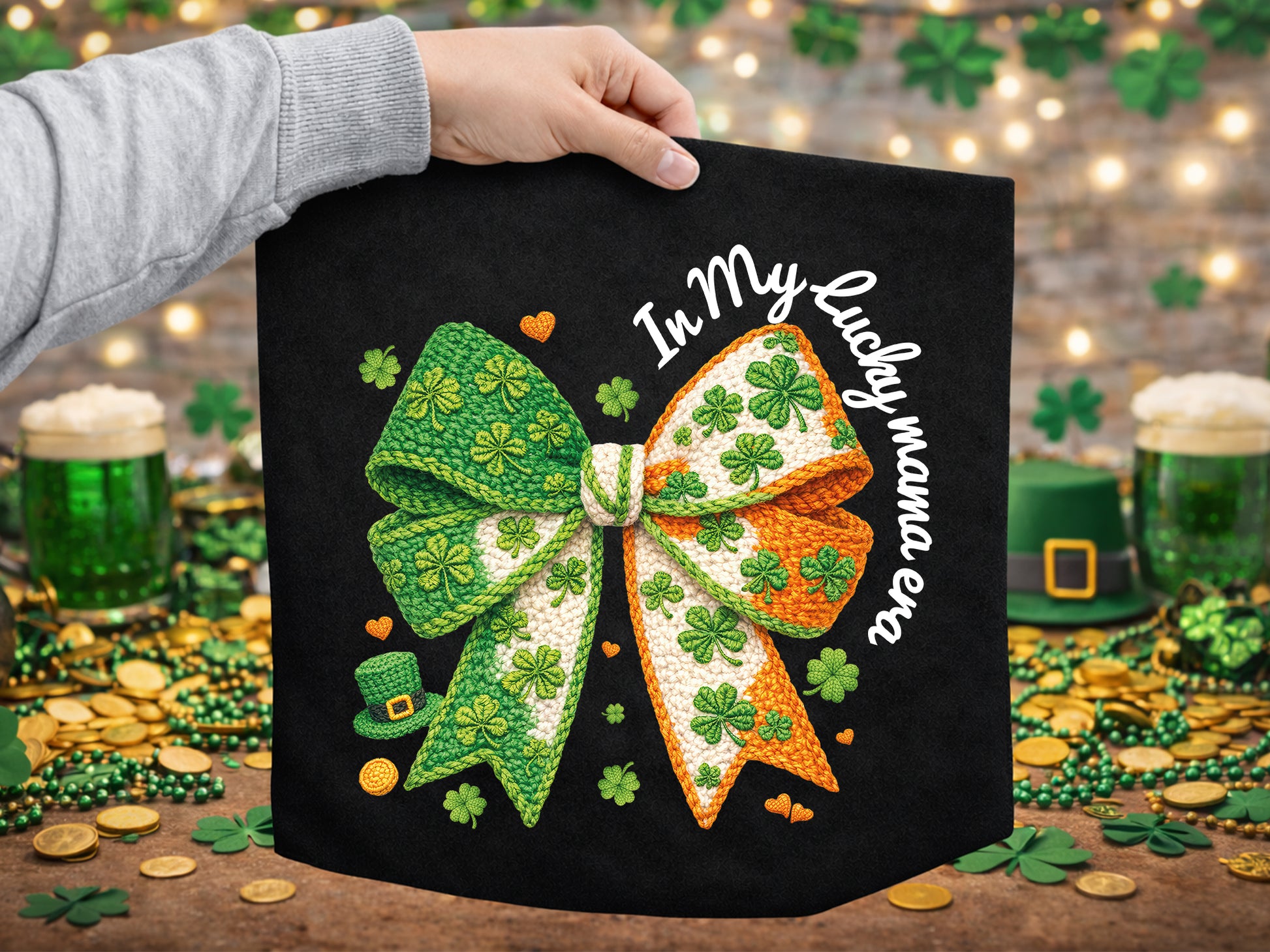 Discover our In My Lucky Mama Era, Coquette St Patrick's Day Faux Yarn PNG sublimation design. This artwork is bursting with warmth and character, making it ideal for moms who enjoy adorable seasonal crafts.