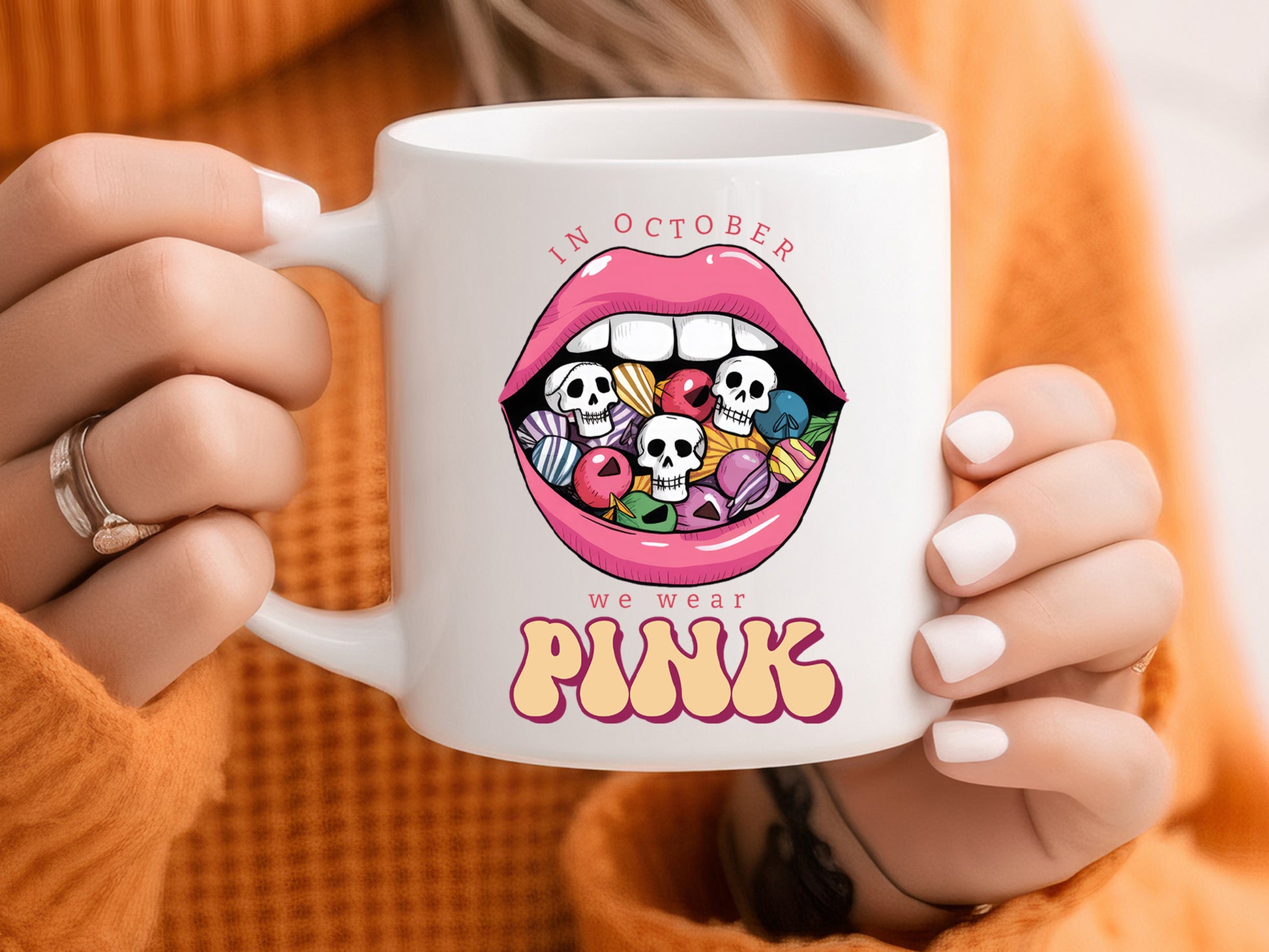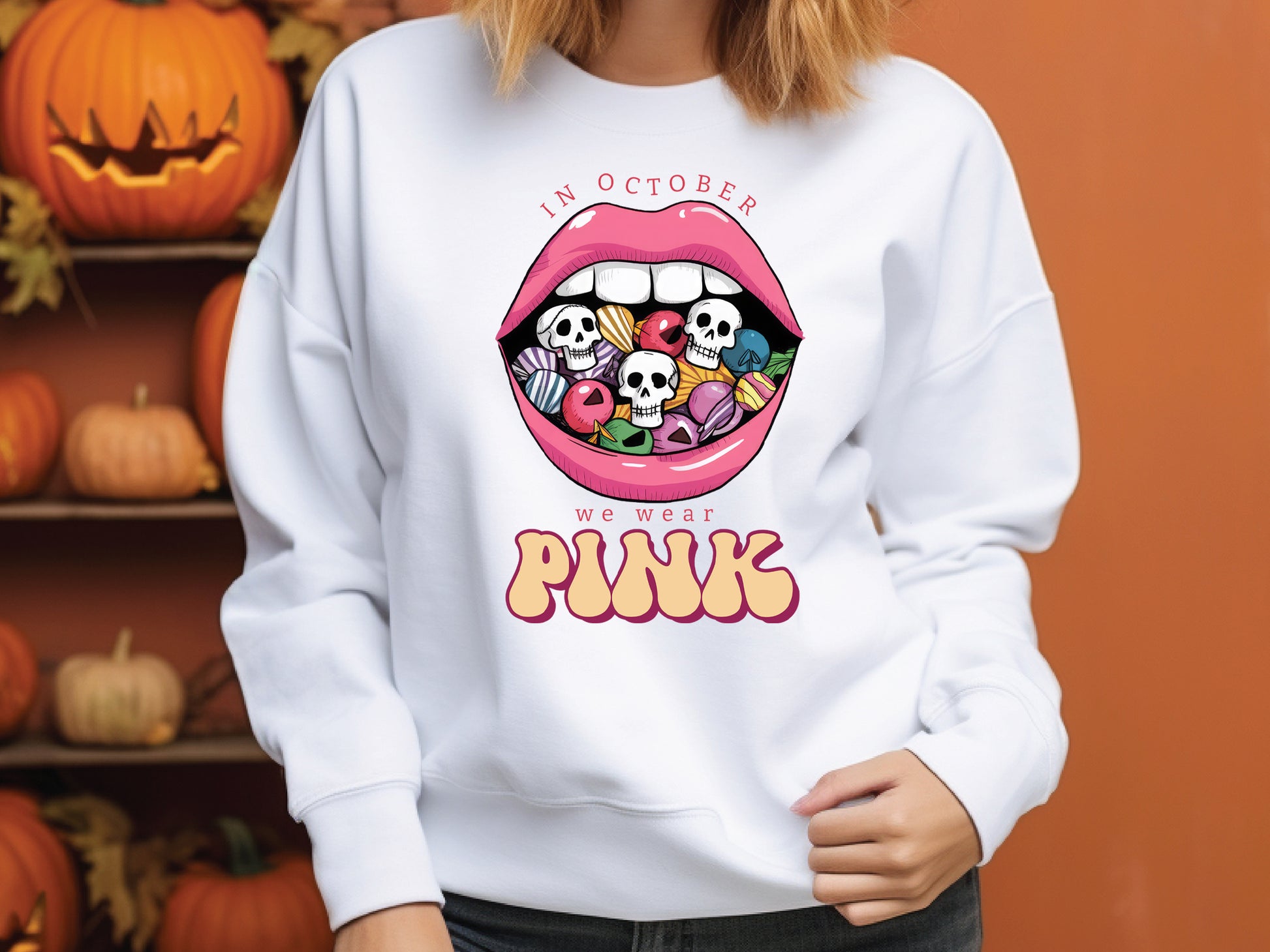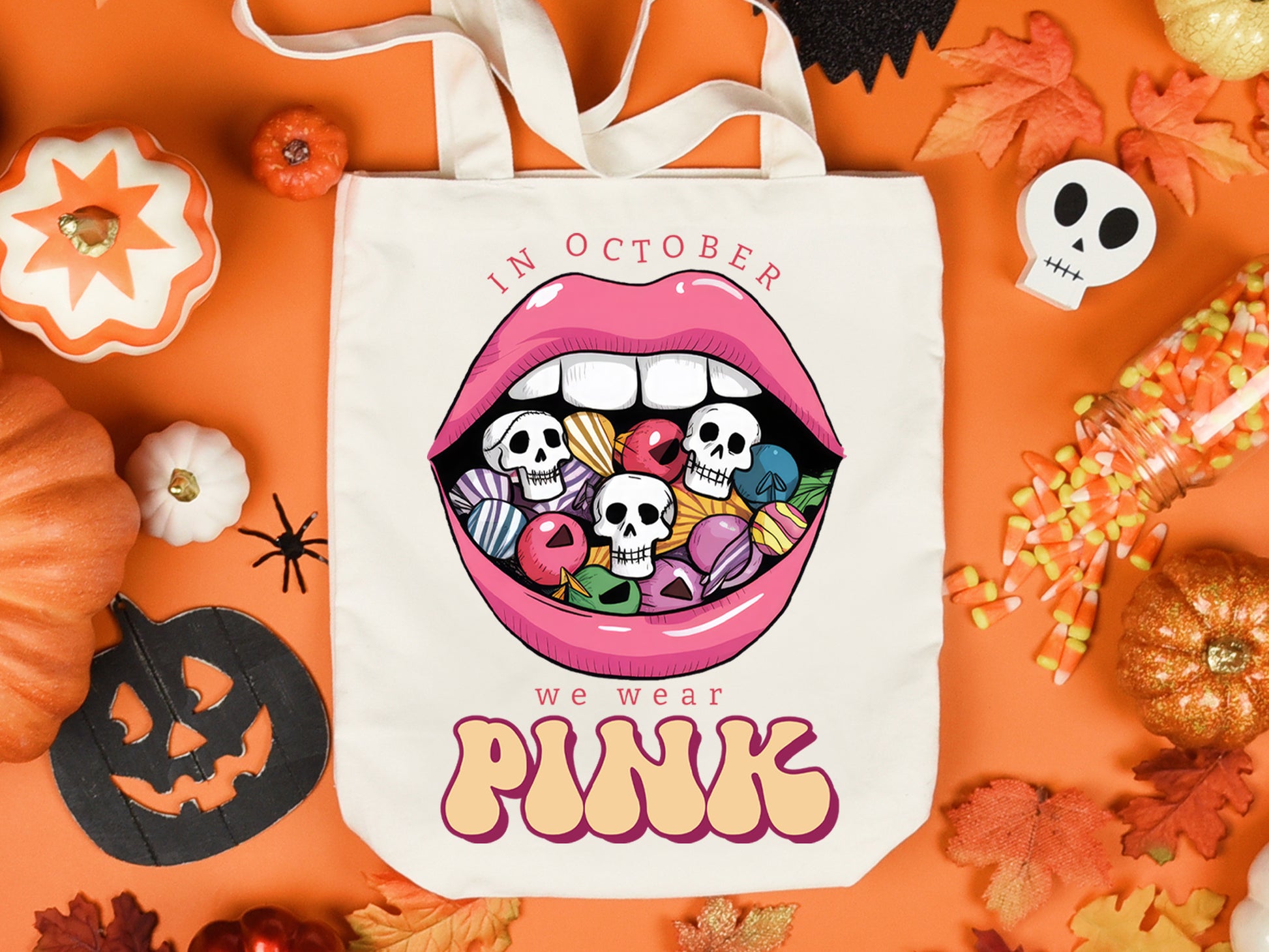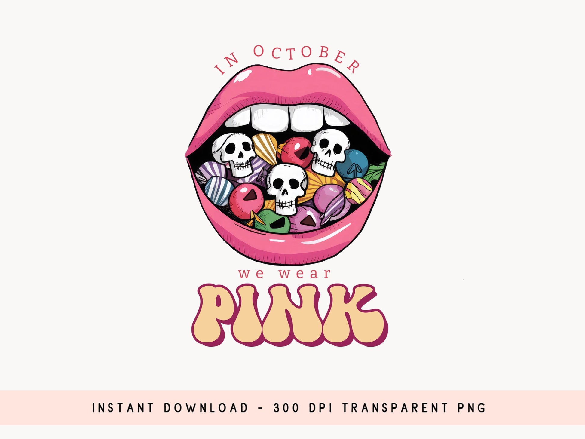 Presenting the eye-catching "In October We Wear Pink - Halloween Sublimation Design", featuring a pink mouth filled with a mix of colorful candies and skulls. Perfect for creating custom sweatshirts, tote bags, mugs, t-shirts, or accessories, it’s an ideal choice for those who want to celebrate the season while promoting breast cancer awareness. This "In October We Wear Pink" design adds a meaningful touch to your Halloween crafts. It is made for enhancing your creative projects or products. Download the In October We Wear Pink sublimation design and make a stylish, supportive statement this October!