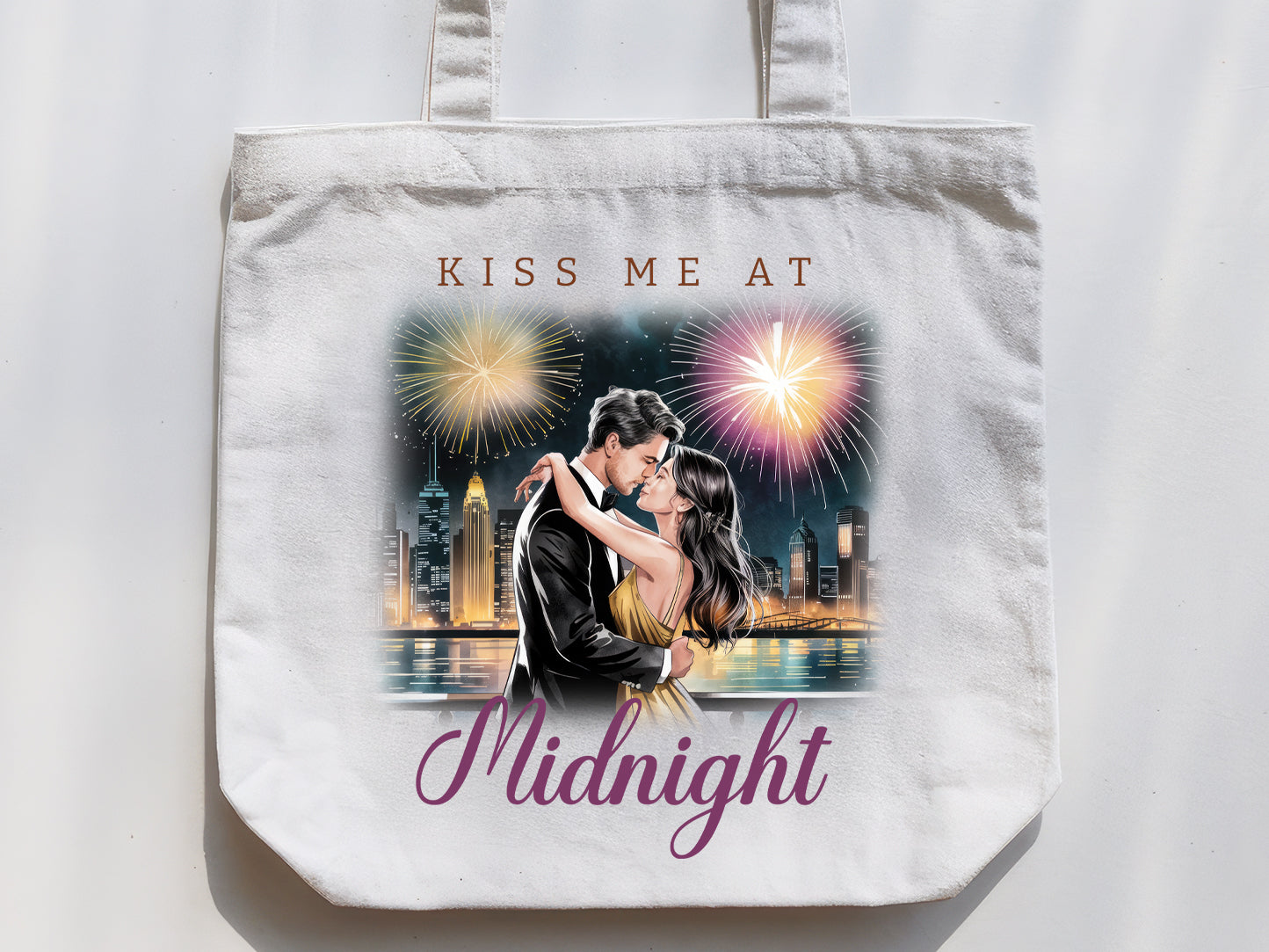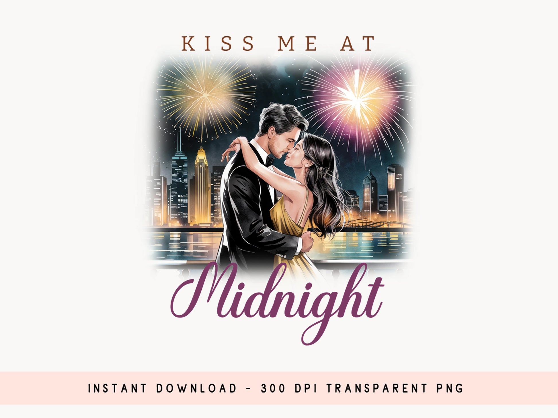 Download our vibrant "Kiss Me at Midnight - New Year Sublimation" design! This charming design is perfect for creating memorable t-shirts, mugs, wine glasses, tote bags, and more. It contains a couple kissing in front of a stunning fireworks display over a cityscape. The phrase "Kiss Me at Midnight" is elegantly displayed, adding a touch of romance and excitement. Its high-quality PNG format ensures vibrant colors, making it ideal for standout sublimation projects. If crafting for yourself or surprising someone special, this New Year Sublimation design adds a touch of romance to your New Year’s creations. Get ready to ring in the year with love and style - the perfect design for a magical midnight! Explore now.