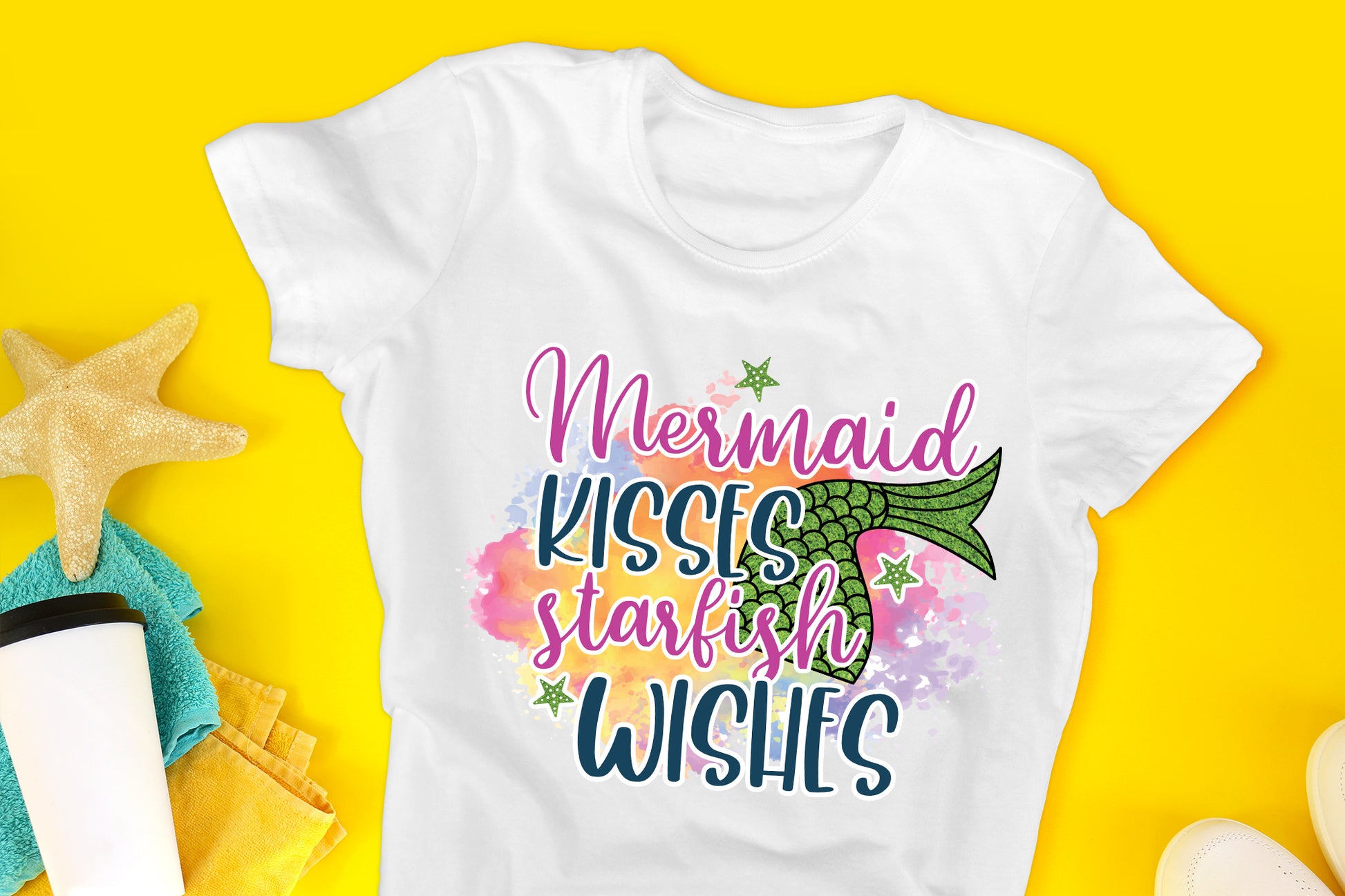Get this Mermaid Kisses Starfish Wishes - Summer PNG Sublimation design, a perfect pick for beach lovers and mermaid fans alike! This high-quality summer design features bright, eye-catching colors and is available as a 300 DPI PNG file with a transparent background. It is ideal for crafting t-shirts, tote bags, mugs, and more. Whether you're creating something for yourself or making gifts for others, this whimsical design is a fantastic addition to your summer projects. It's compatible with various crafting methods, so you can easily use the "Mermaid Kisses Starfish Wishes" design with Cricut, Silhouette, and other heat press machines. Jump into a sea of creativity and share those summer vibes with this charming ocean-themed design!