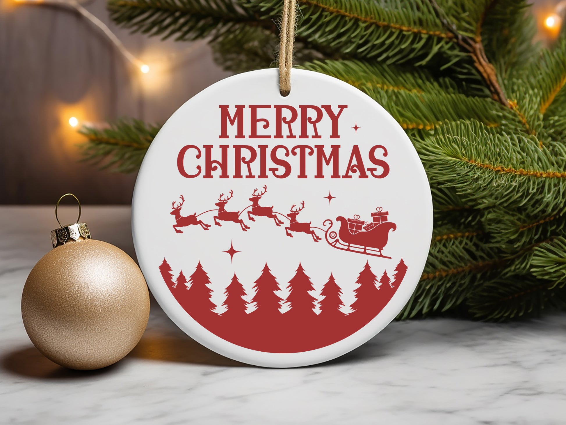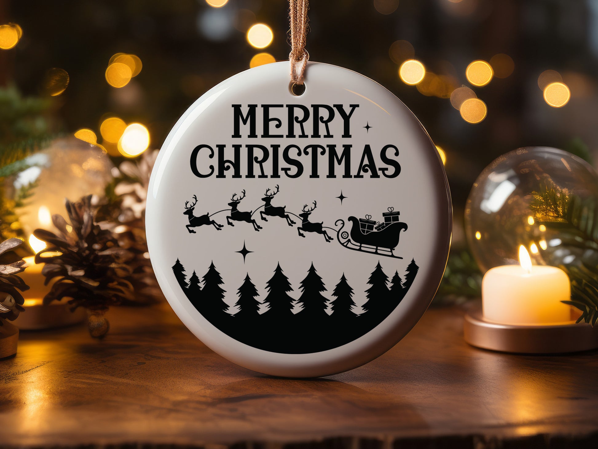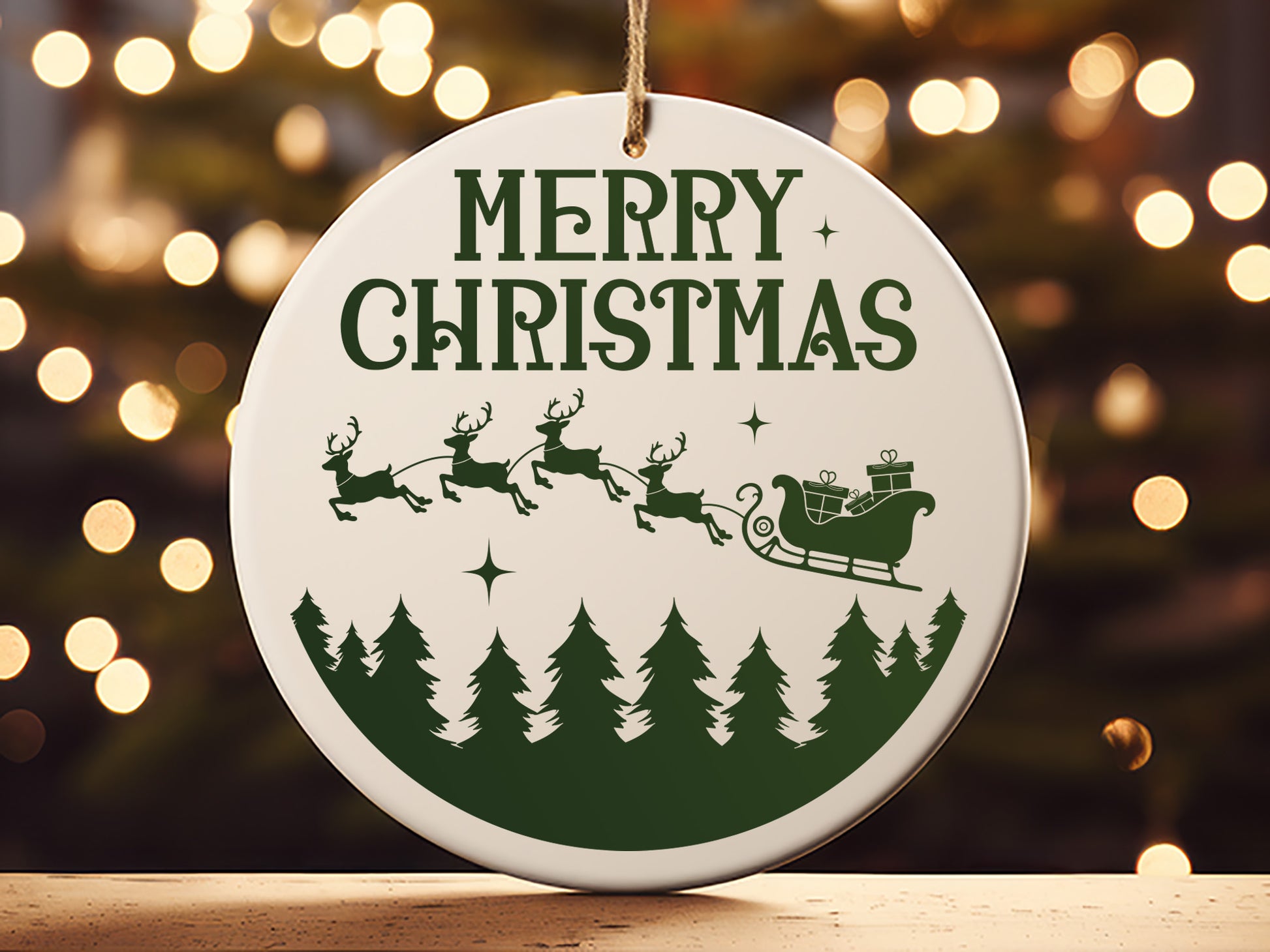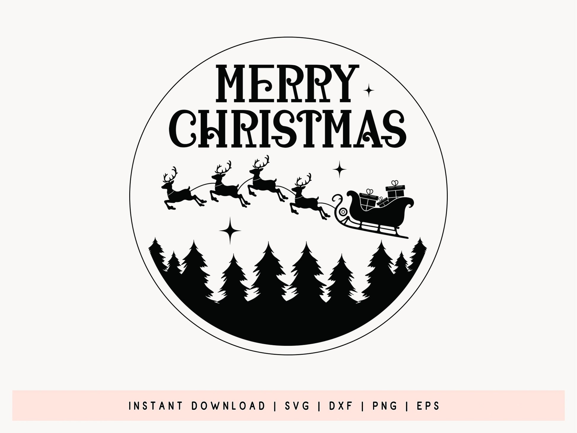 Take a look at the Merry Christmas Handmade Ornament SVG Design, a perfect way to add a personal touch to your holiday decorations. It includes the phrase "Merry Christmas" surrounded by a circular silhouette of Santa Claus and his reindeer flying over a forest of pine trees. This high-quality SVG Design is perfect for creating handcrafted Christmas ornaments that will stand out on your tree. Whether you're using it for crafting with vinyl, wood the "Merry Christmas" design brings a festive and warm feel to any space. Perfect for making unique gifts or unique ornaments for your home, the Merry Christmas Handmade Ornament SVG design is a must-have for holiday crafting projects! Download now.
