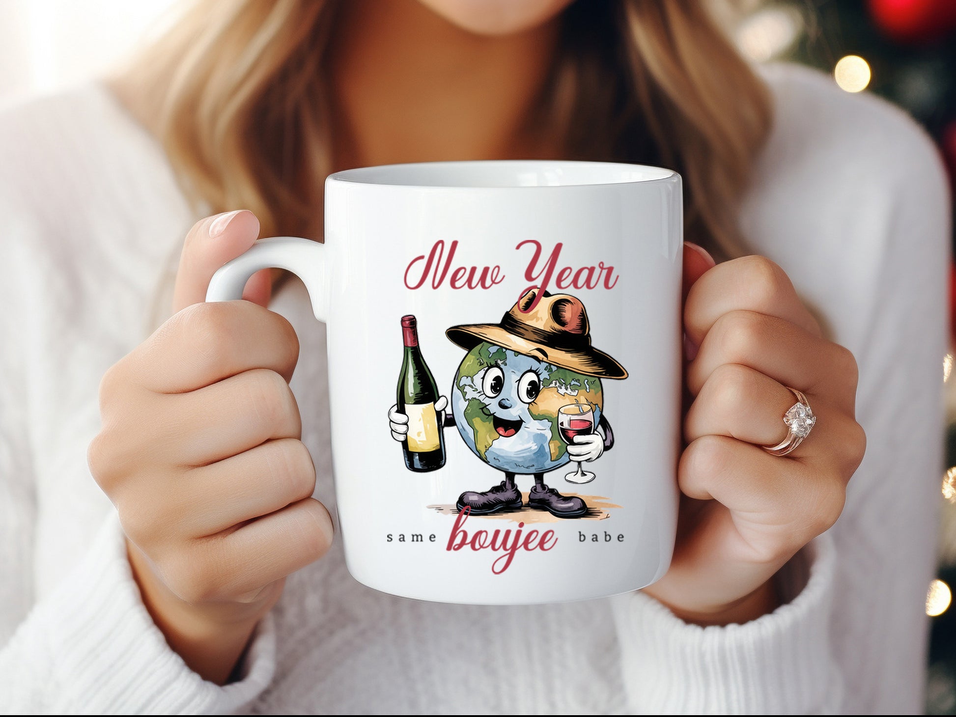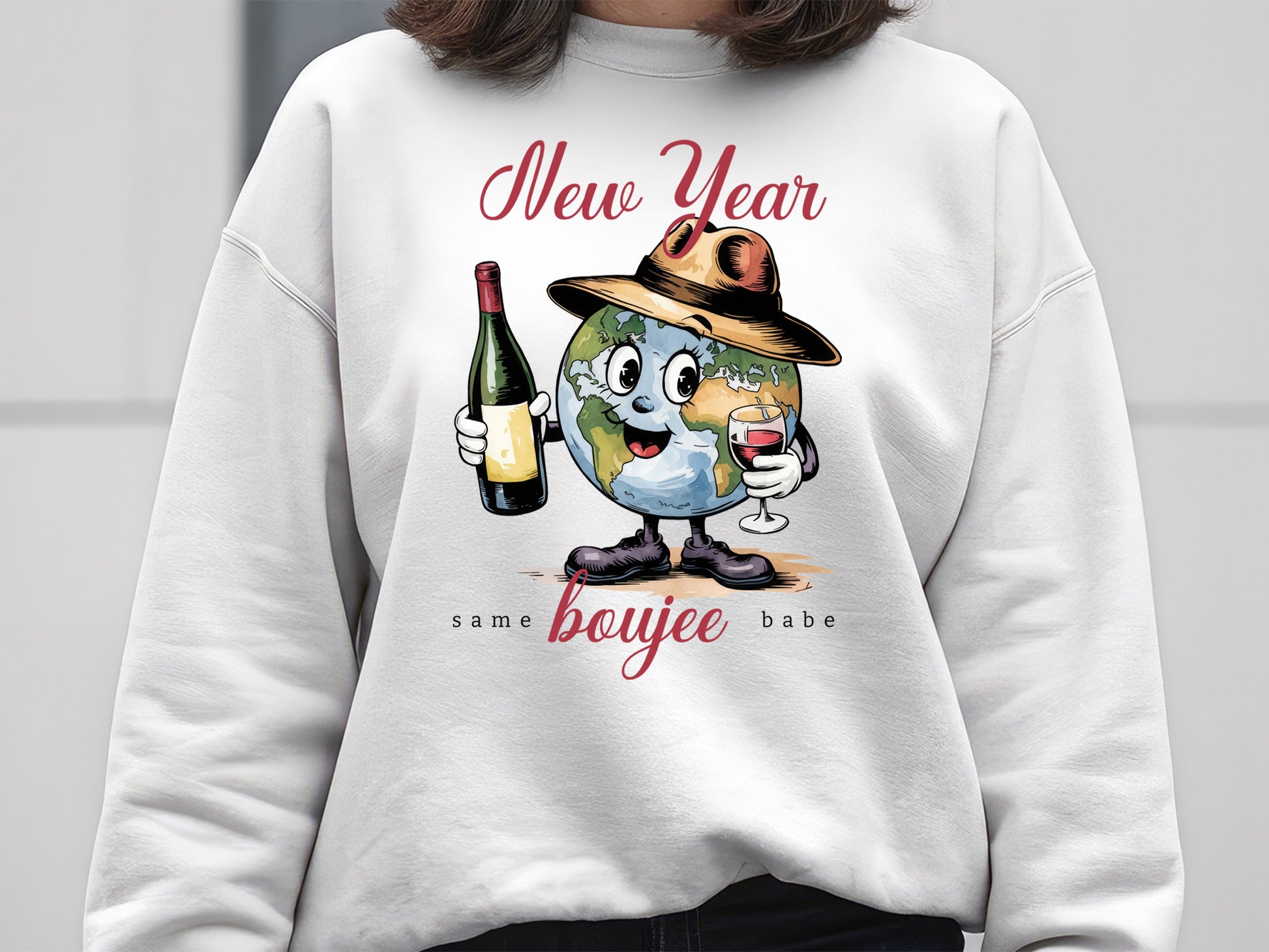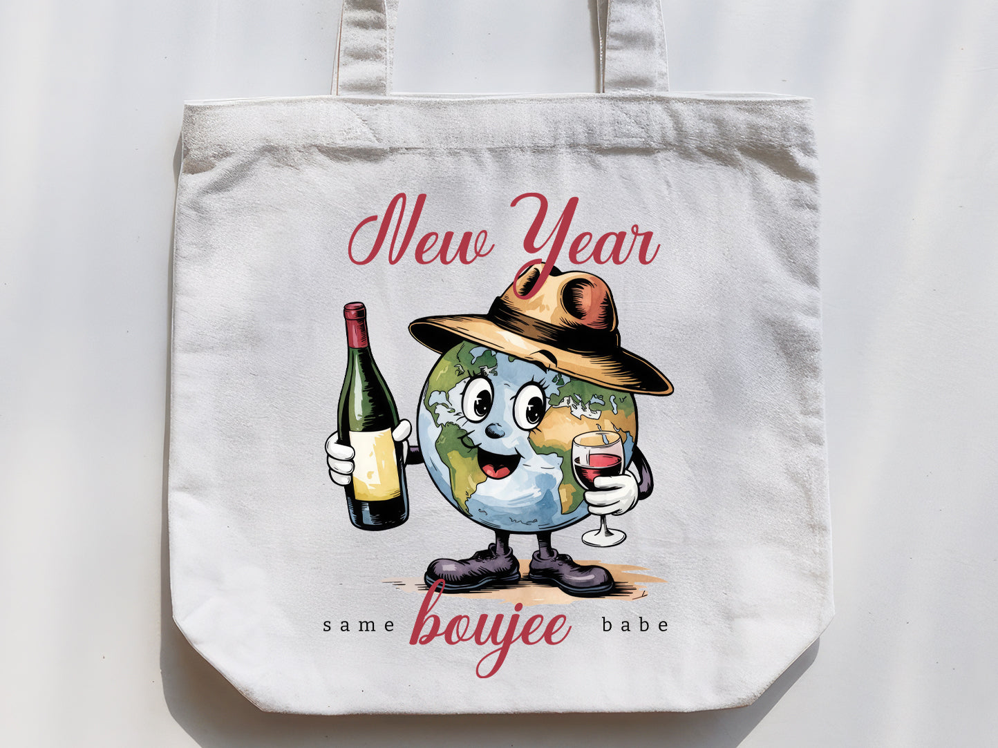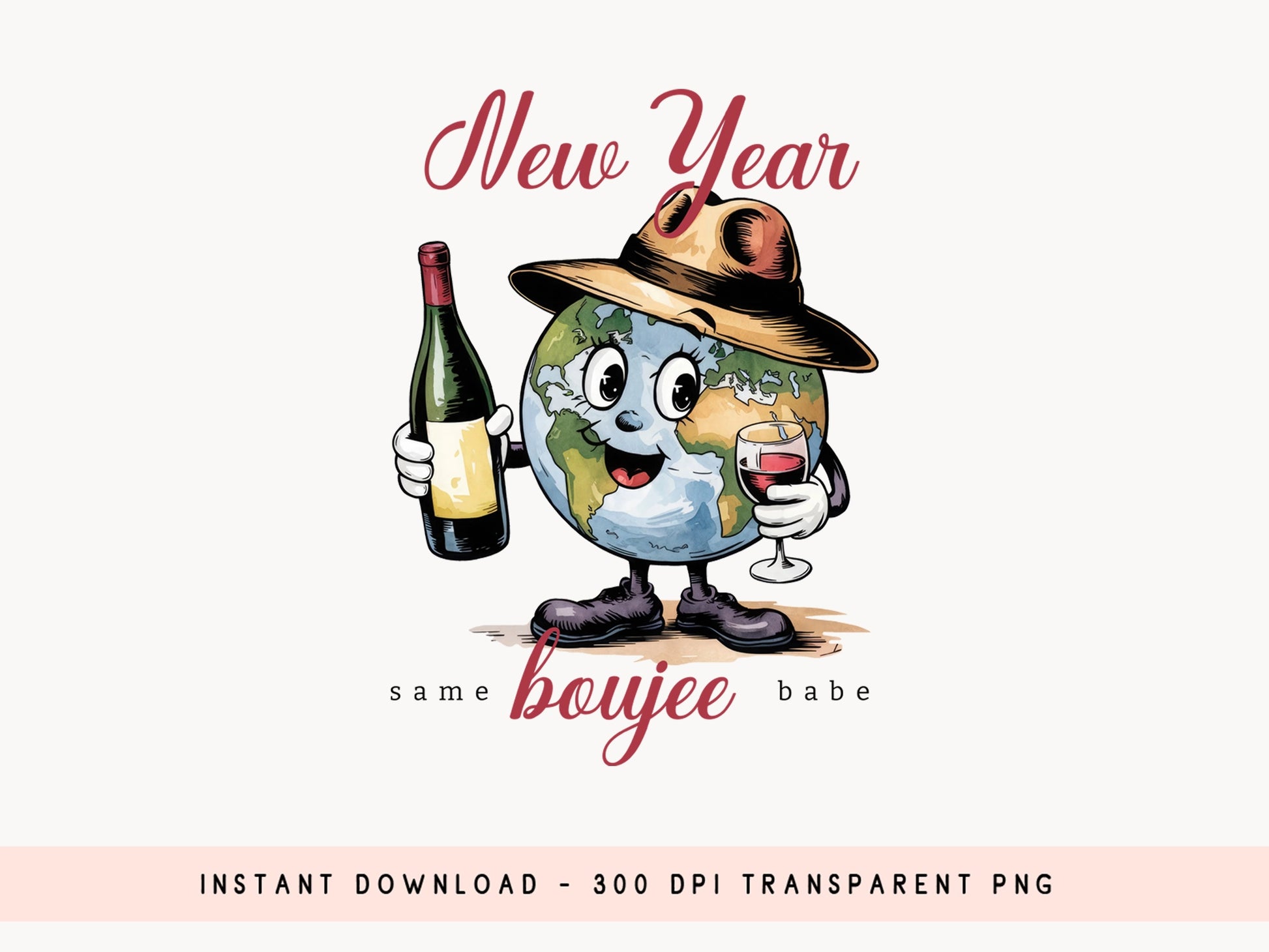 Introducing the "New Year Same Boujee Babe PNG Sublimation design, Perfect for those who add a chic, sassy touch to their t-shirts, mugs, tote bags, sweatshirts, and more. It includes a playful illustration of the Earth as a person, wearing a hat and holding a bottle of wine and a glass of wine. The high-quality PNG format ensures vibrant colors, making it perfect for eye-catching sublimation projects. Whether you're creating heartwarming gifts for friends, family, and loved ones, this playful "New Year Same Boujee Babe" design brings a fashionable flair to New Year’s celebrations. Get the New Year PNG Sublimation design today and start designing.