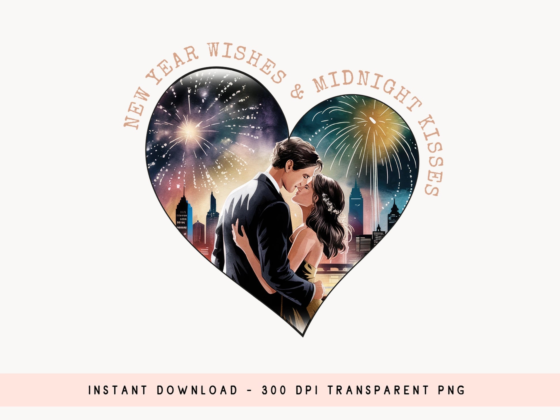 Buy the versatile New Year Wishes & Midnight Kisses Sublimation PNG design! Perfect for adding a sweet, festive touch to t-shirts, mugs, tumblers, totes, hoodies, and more. Featuring a couple kissing in front of a stunning fireworks display over a cityscape that will elevate your any romantic New Year's Eve project. The included PNG format is ideal for standout sublimation projects. Whether crafting for a romantic gift or creating a memorable party keepsake, this "New Year Wishes & Midnight Kisses" design brings a loving, heartfelt vibe to your New Year’s celebrations. Get ready to celebrate the New Year as a couple with this vibrant New Year Sublimation PNG design. Explore now!