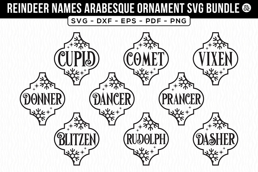 Add a touch of elegance to your holiday crafts with our Reindeer Names Arabesque Ornament SVG Bundle Vol 2. Create stunning decorations with 09 beautifully designed reindeer names in an intricate Arabesque style. Perfect to create unique ornaments for your Christmas tree, or to make other festive crafts.