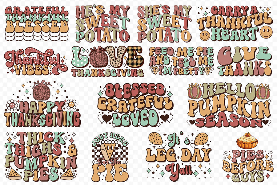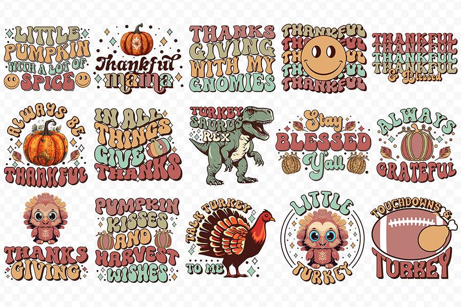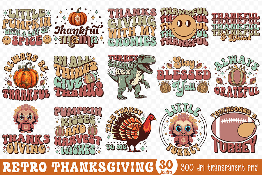 Welcome to our Retro Thanksgiving Sublimation Bundle! A unique collection of 30 eye-catching and vibrant designs that are perfect for adding a touch of thanksgiving to any project. These designs are great for creating t-shirts, mugs, tote bags, pillows, and much more!