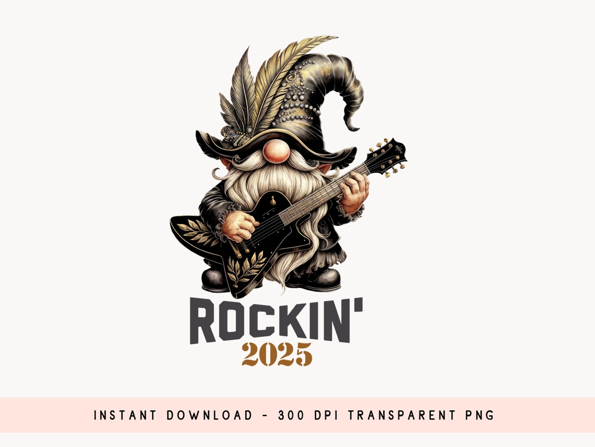 Discover the vibrant "Rockin' 2025 - New Years Sublimation Design," ideal making for standout sublimation projects. Perfect for music lovers and party-goers, this unique design adds energy and excitement to t-shirts, mugs, hats, hoodies, and more. Featuring a rockstar gnome playing a guitar. The gnome is dressed in a stylish outfit with a feather hat and sunglasses that'll elevate your any New Year event. If you're creating heartwarming gifts, this New Years Sublimation Design is great and lets you kick off 2025 with style and attitude. Get ready to rock into the new year with this "Rockin' 2025" design addition to your New Year’s creations! Purchase now.