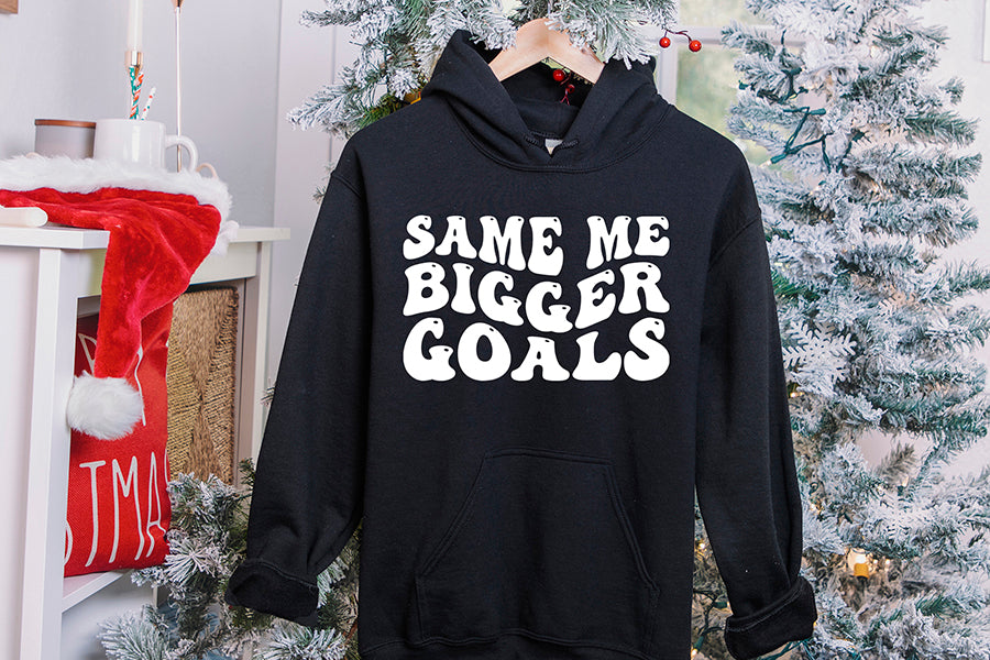 Make unique and festive New Year's Eve products and gifts with this Same Me Bigger Goals SVG New Year Shirt design, suited for the upcoming New Year's Eve projects. Ideal to use for t-shirts, mugs, tote bags, cards, hoodies, pillows, and much more!