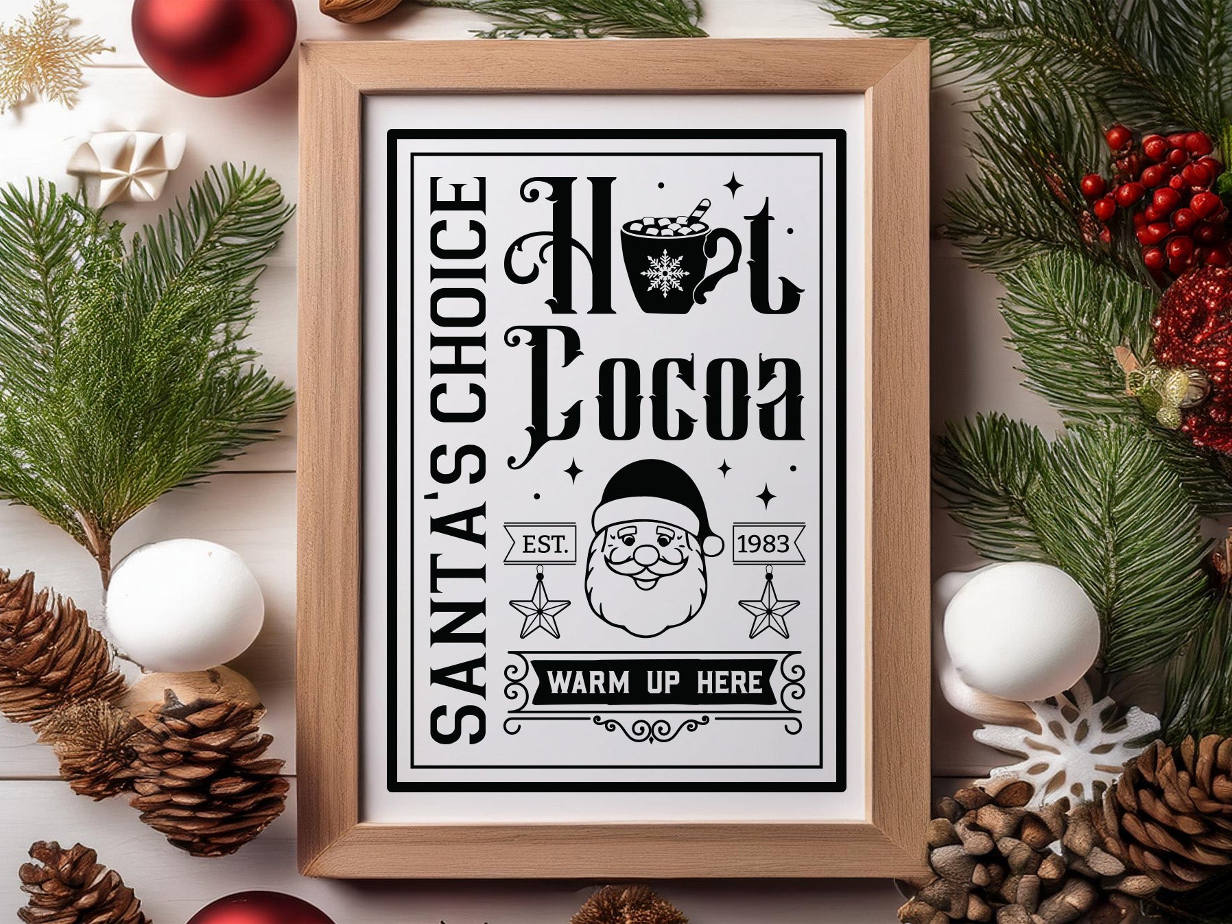 Take a look at our versatile Santa's Choice Hot Cocoa Wood Sign SVG file, a charming and high-quality design ideal for crafting a rustic wood sign for your kitchen or hot cocoa bar. Featuring playful holiday fonts and cozy graphics, It is perfect for farmhouse or classic Christmas decor. Designed for use with various machines such as Cricut, Silhouette, and vinyl cutters. This Hot Cocoa Sign SVG is versatile for wood, framed signs, or glass applications, making it easy to create a unique piece for your holiday setup. Whether enhancing your own decor or gifting a handcrafted sign, the "Santa's Choice Hot Cocoa" design is a great addition. Purchase now!