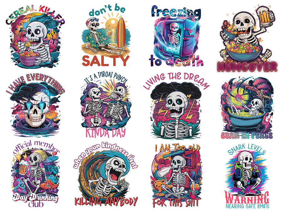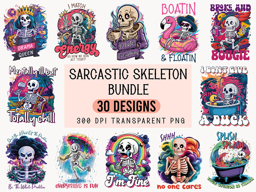 Discover the Sarcastic Skeleton PNG Sublimation Bundle, a curated selection of 30 vibrant and eye-catching designs that are perfect for those looking to add a touch of sarcasm and humor to their projects. From funny quotes to witty illustrations, this Sarcastic Skeleton Sublimation has everything you need. These sublimation designs are sure to make a statement wherever used. You can print them on your physical products as gifts or sell the products you print such as t-shirts, mugs, tote bags, hoodies, pillows and much more. Download now and start making your sarcastic creations.