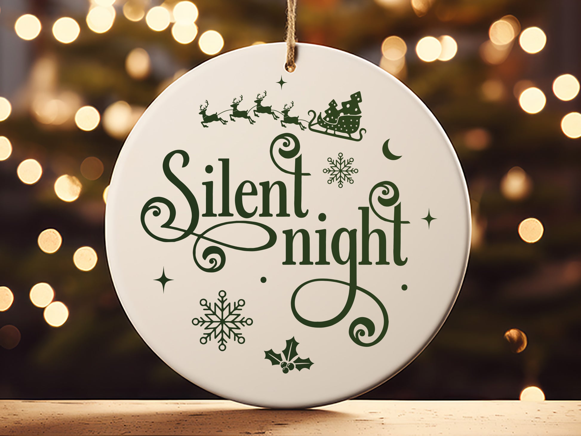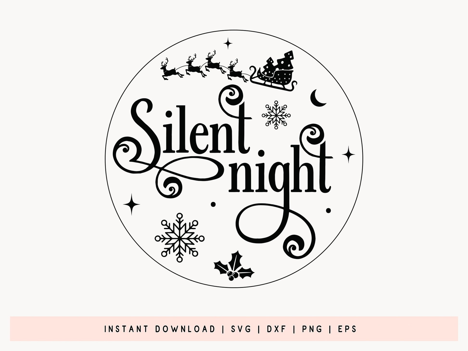 Presenting the "Silent Night - Best Christmas Ornament SVG Design," perfect for adding a serene and elegant touch to your holiday decorations. This beautifully crafted SVG features intricate snowflakes, a crescent moon, and Santa Claus riding a sleigh with reindeer that captures the peaceful essence of the season. Whether you're creating a personalized ornament for your tree or crafting a thoughtful gift, this Best Christmas Ornament SVG design is perfect for any DIY holiday project. Easy to cut and customize, it’s ideal for Cricut, Silhouette, or vinyl projects,. Embrace the calm and beauty of Christmas with this stunning "Silent Night" ornament design! Grab now.
